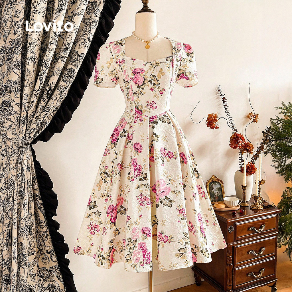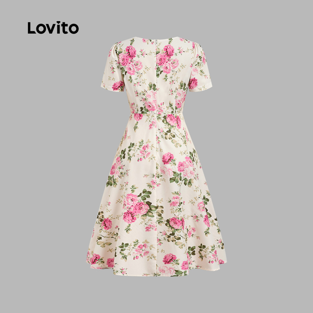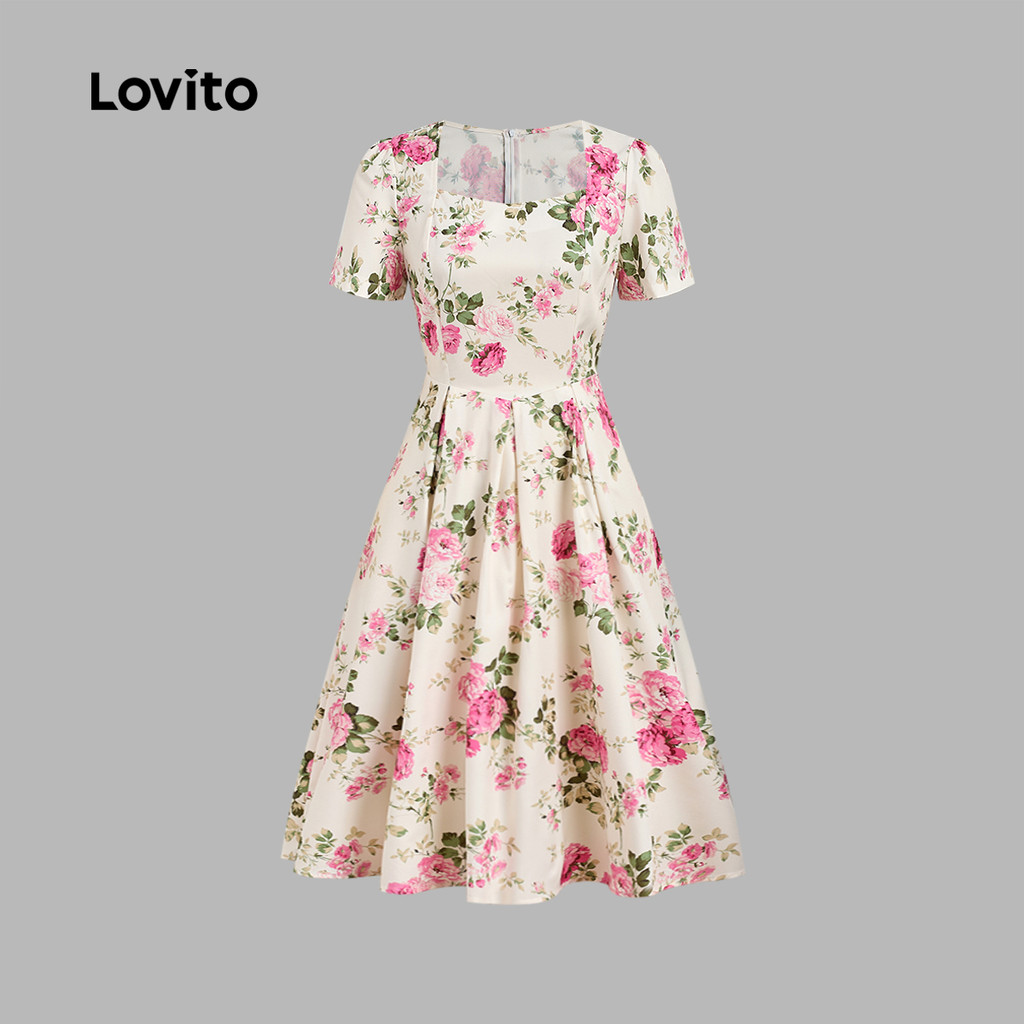 Lovito Padrão de Vestido Elegante com Zíper Vestido Plissado Primavera/verão para Mulheres. LBL33264
