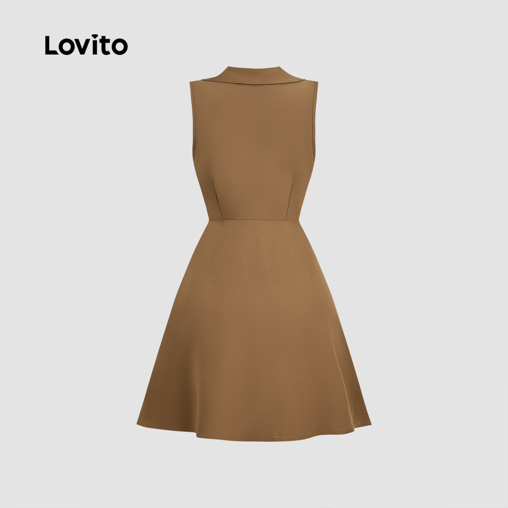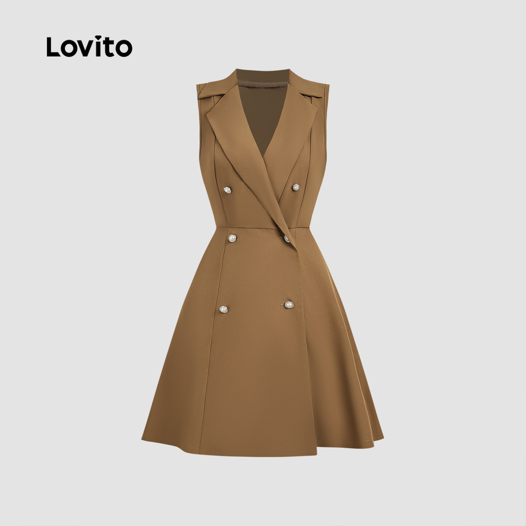 Lovito Vestido Elegante Duplo Botão para Deslocamento Primavera/verão Vestido Cáqui para mulheres. LBL33013