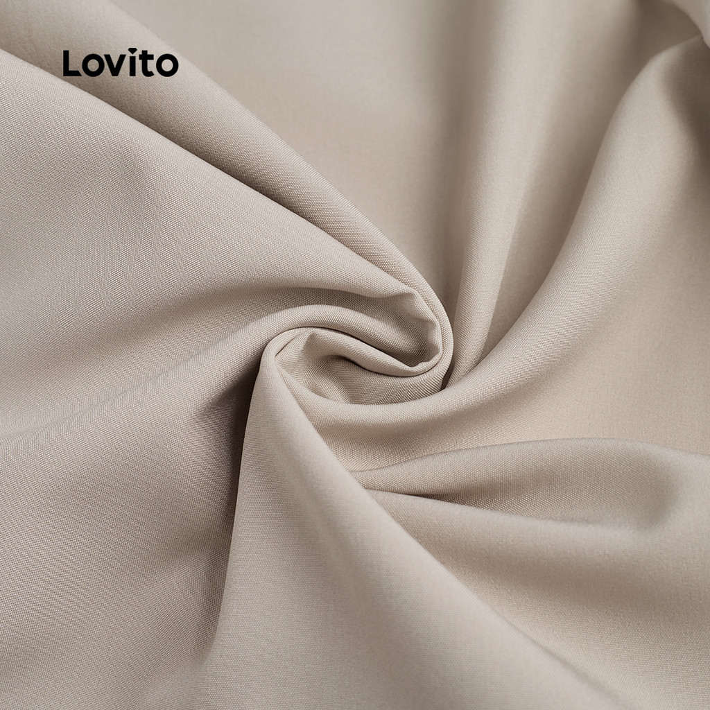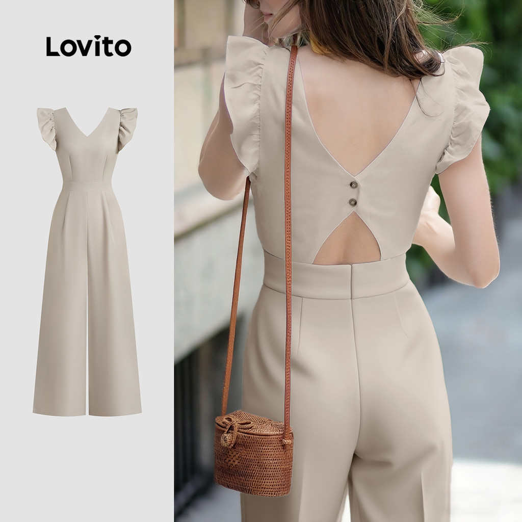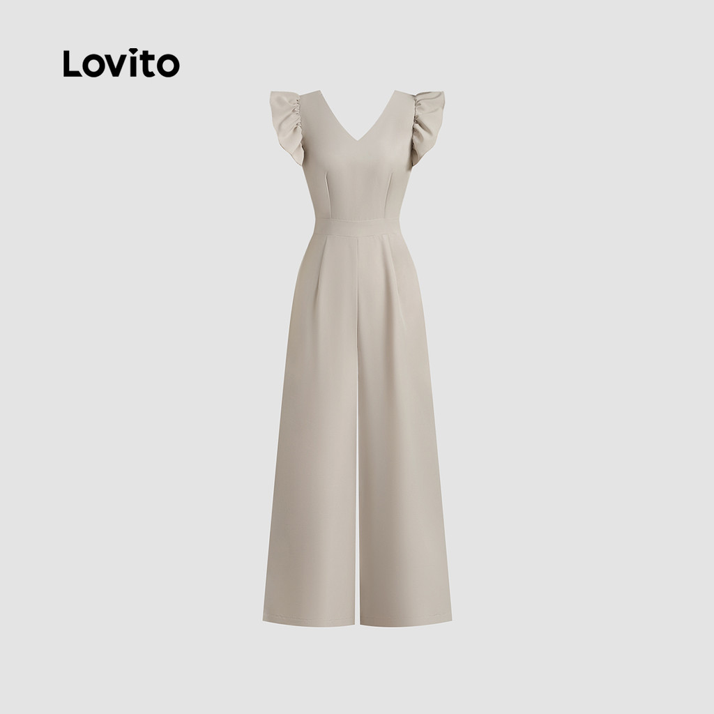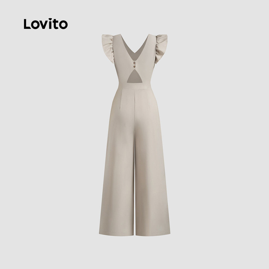 Lovito Macacão Feminino Casual com Babados Botões Costas Sem Mangas Primavera Verão Caqui L142ED099