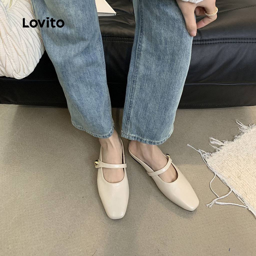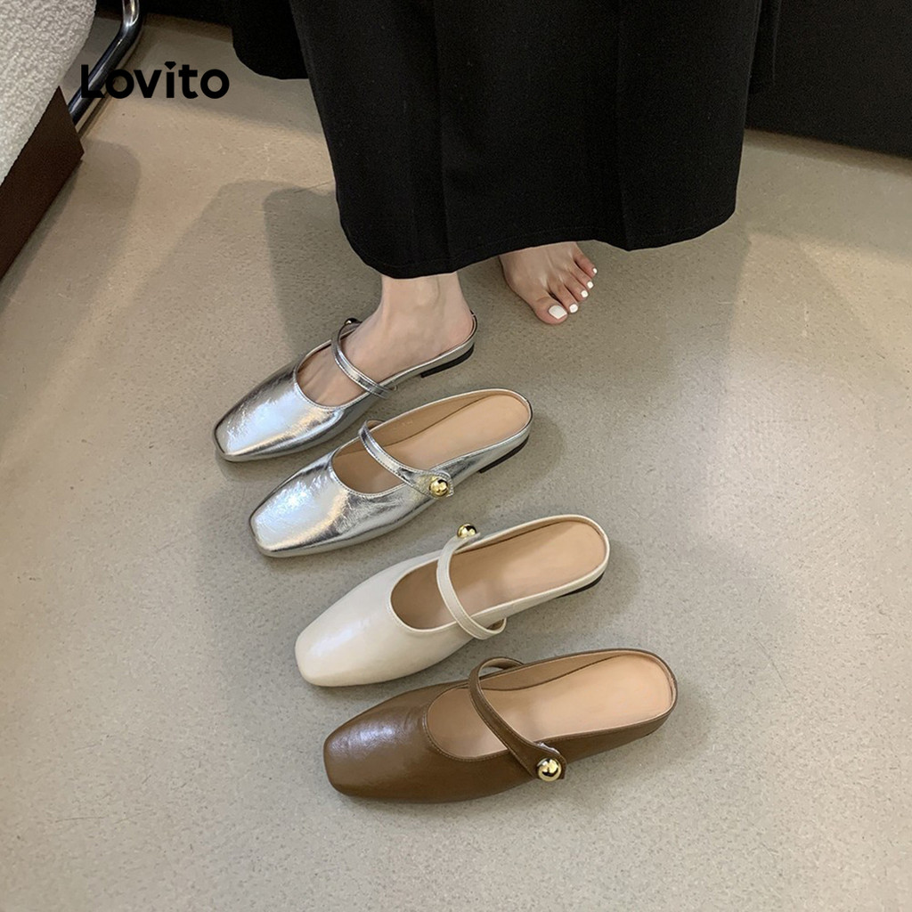 Lovito Sapatos Lisos Casuais Femininos Quadrados Sandálias Couro Sapatilhas LFA82134
