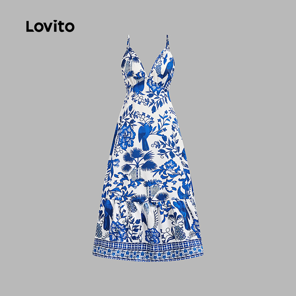 Lovito Vestido de Festa Boho Estilo Resort Primavera/Verão Azul Branco LK2LD367