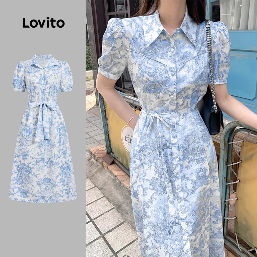 Lovito Refine Vestido Feminino Azul Claro Primavera Verão Com Botões Dianteiros E Estrutura Artesanal L134LD352