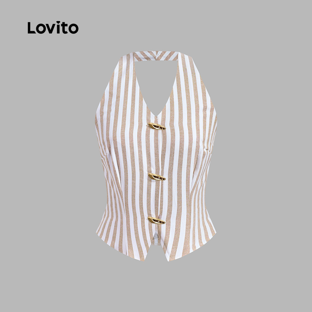 Lovito Conjunto Elegante Blusa Calça Listrada Shorts Fivela Metálica Primavera/verão Calça Marrom Para Mulheres LBL30237