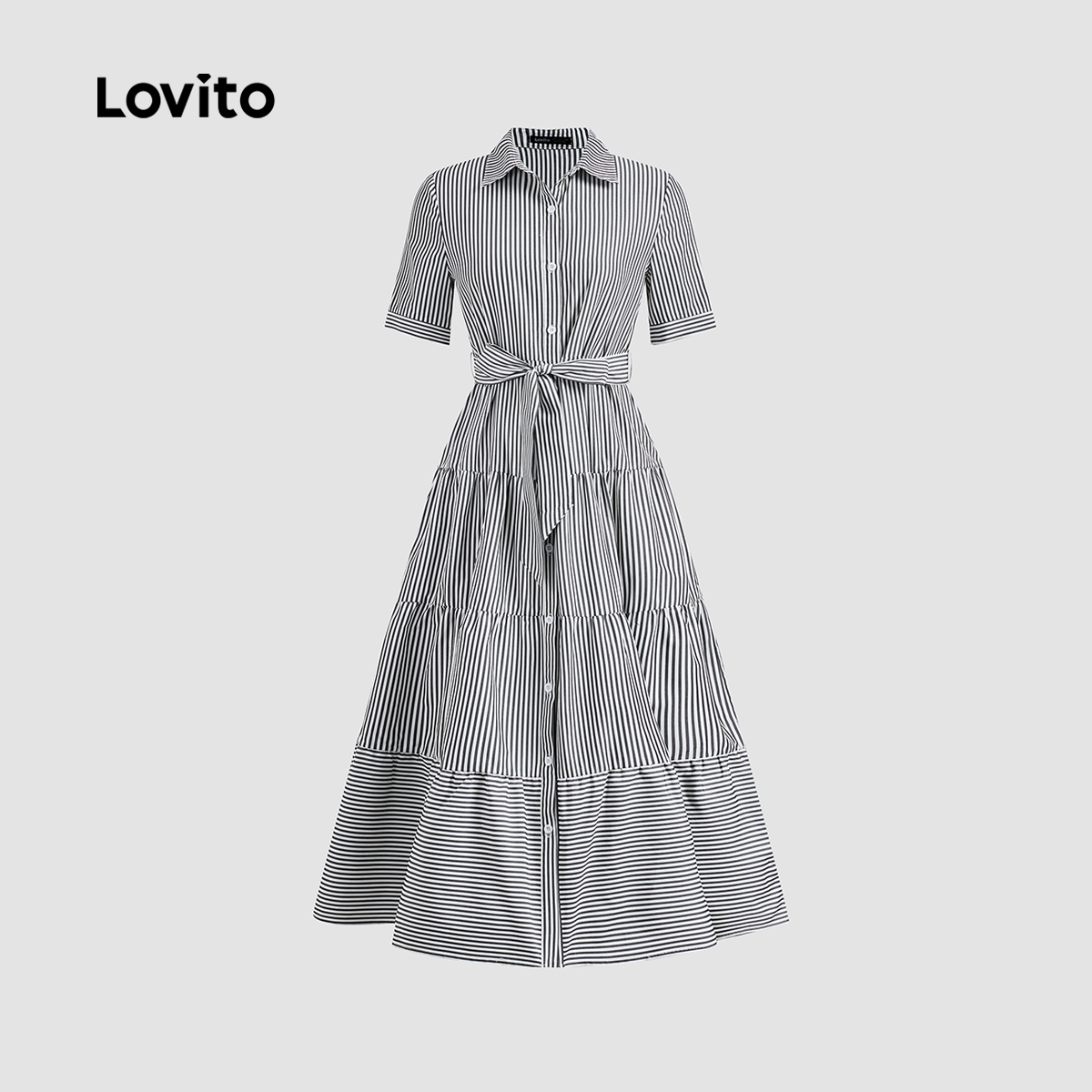 Lovito x Glenda Vestido Casual Listrado Com Botão Frontal E Cinto Para Mulheres LNL79306