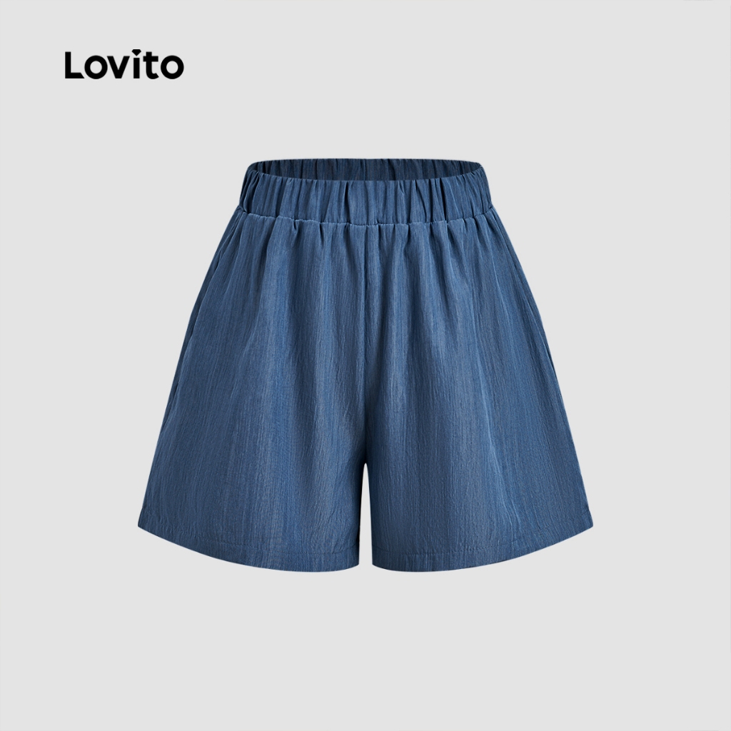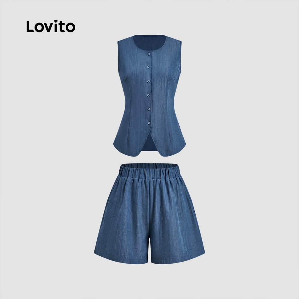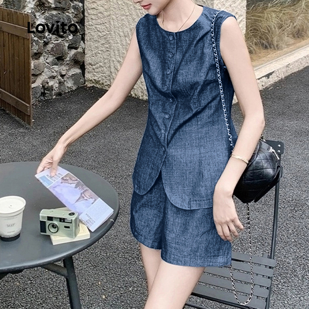 Lovito Conjunto Casual Linho Confortável Composto Regata Shorts Botões Azul-marinho Primavera/verão Mulheres LBL30111