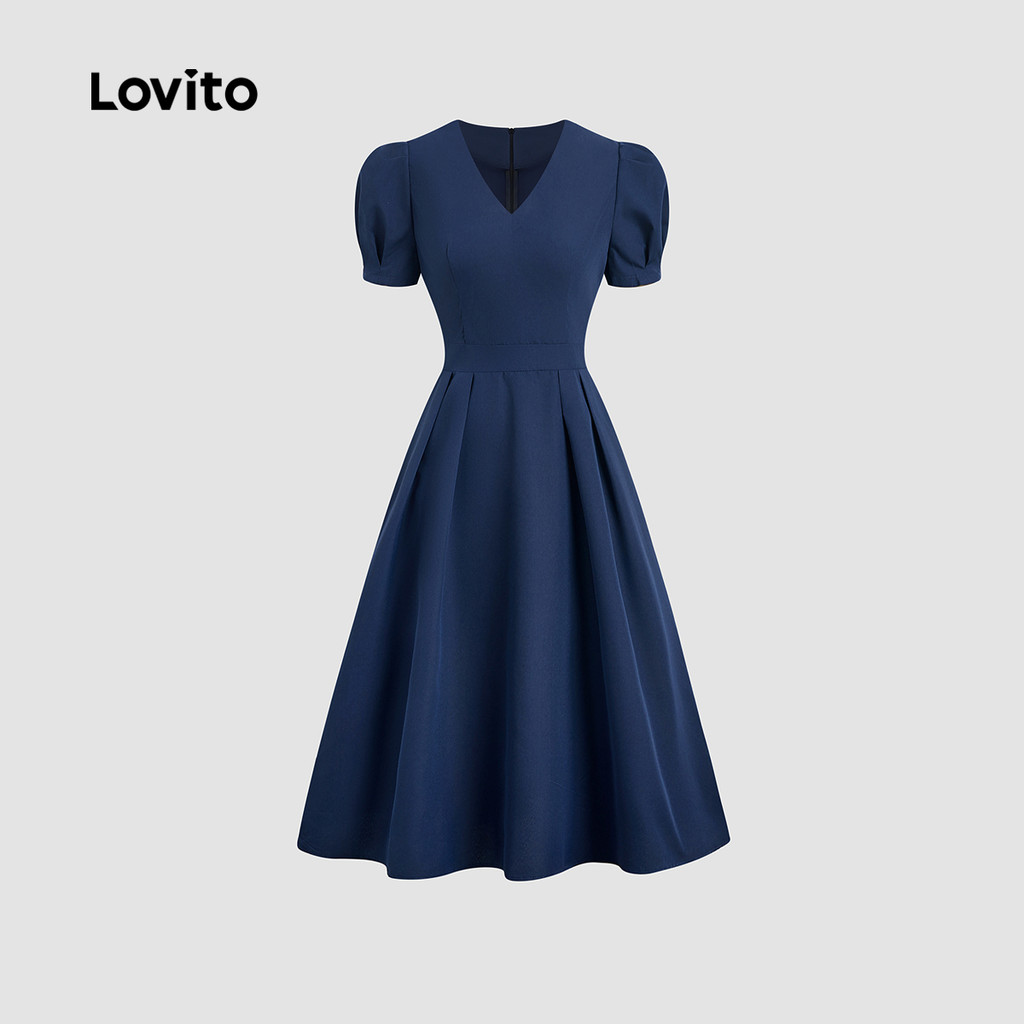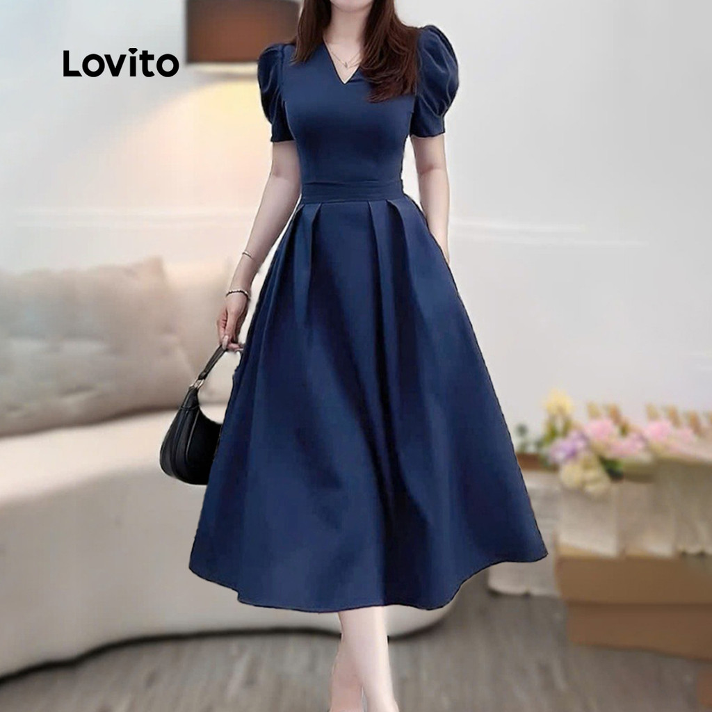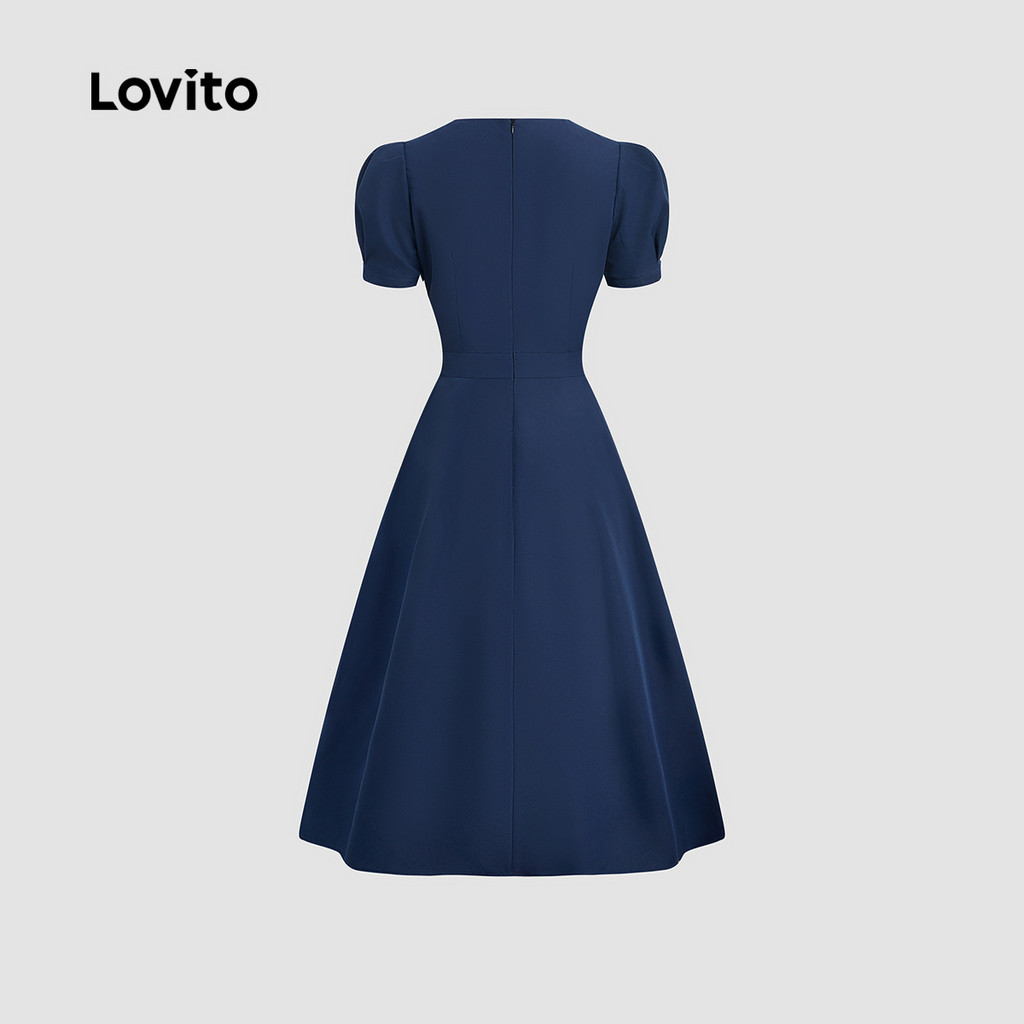 Lovito Vestido Azul-marinho com Pregas Simples para Primavera/verão, Elegante para Mulheres L155ED1159