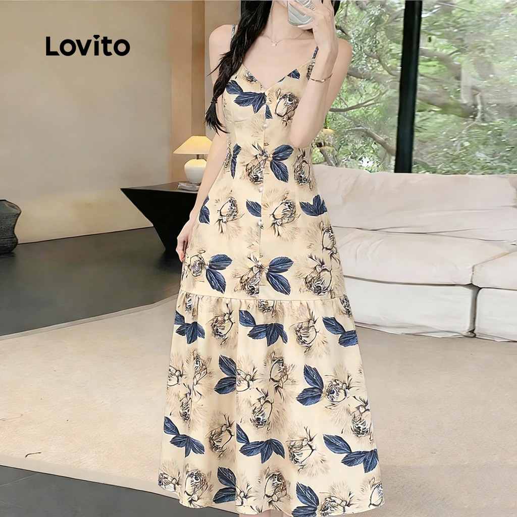 Lovito Vestido Casual com Babado Na Bainha Alça Ajustável Estampa para Primavera/verão para Mulheres. L177ED096