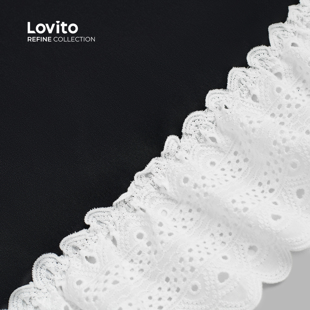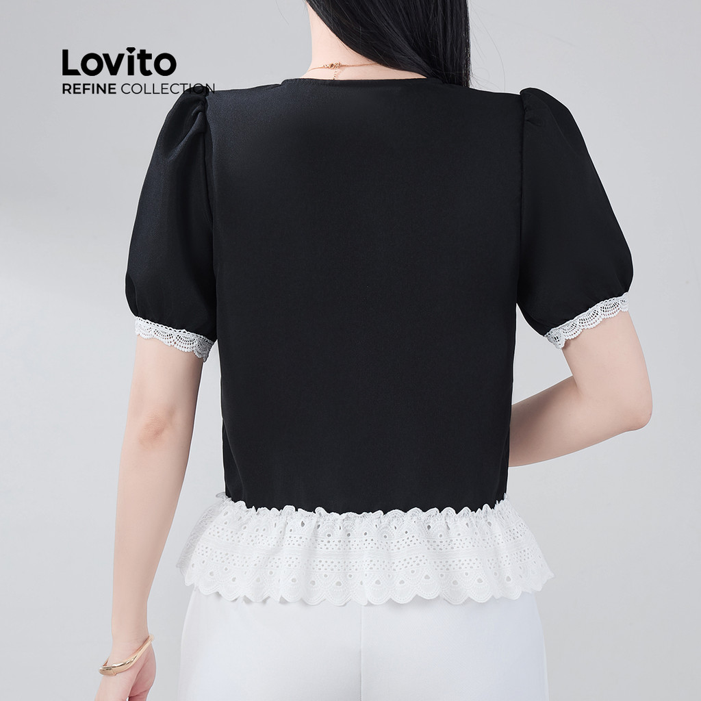 (Refine by Lovito) Blusa Costura Exagerada com Babados Colorblock Primavera/verão Blusa Preta para Mulheres. LR29E038