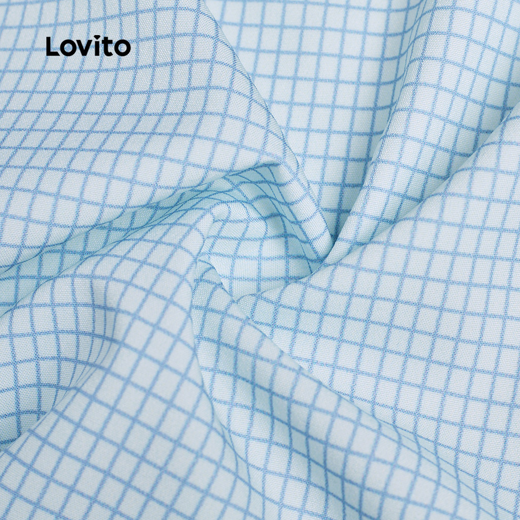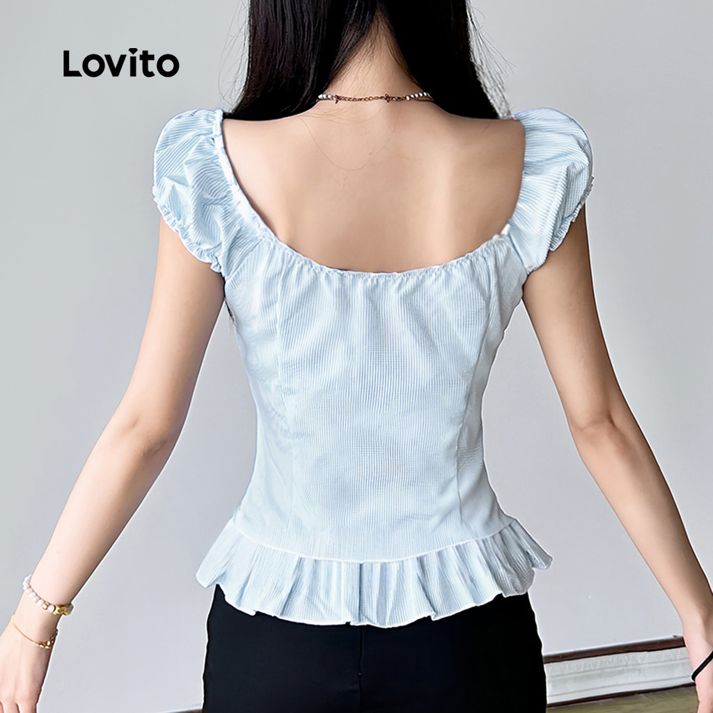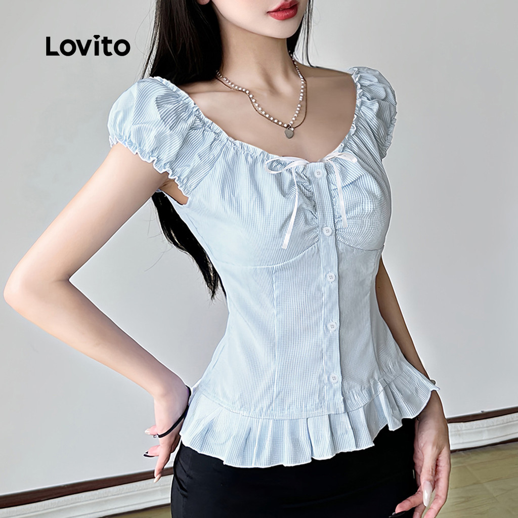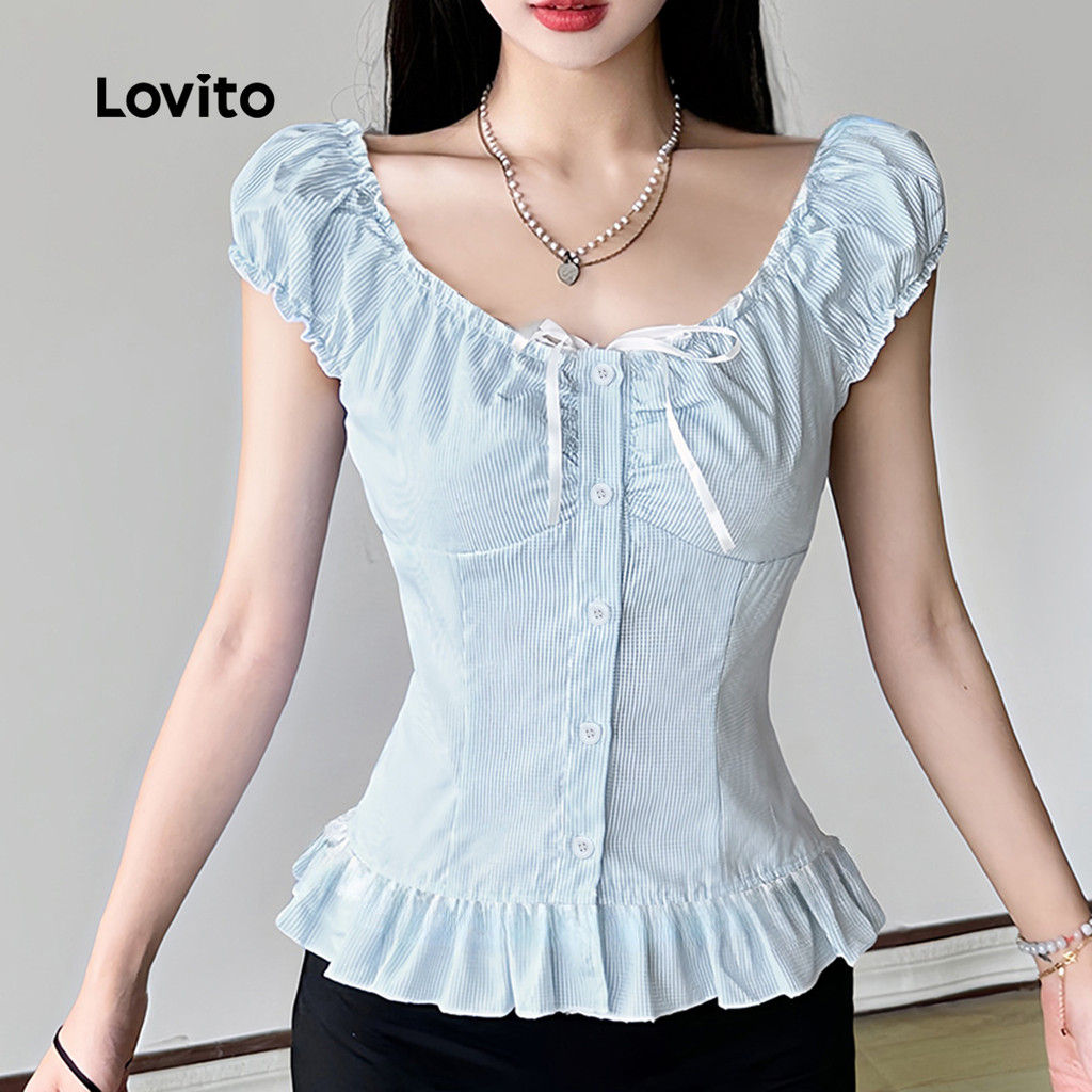 Lovito Blusa Fofa com Botão Franzido Femininas Primavera/verão Blusa Azul para mulheres. L173AD108
