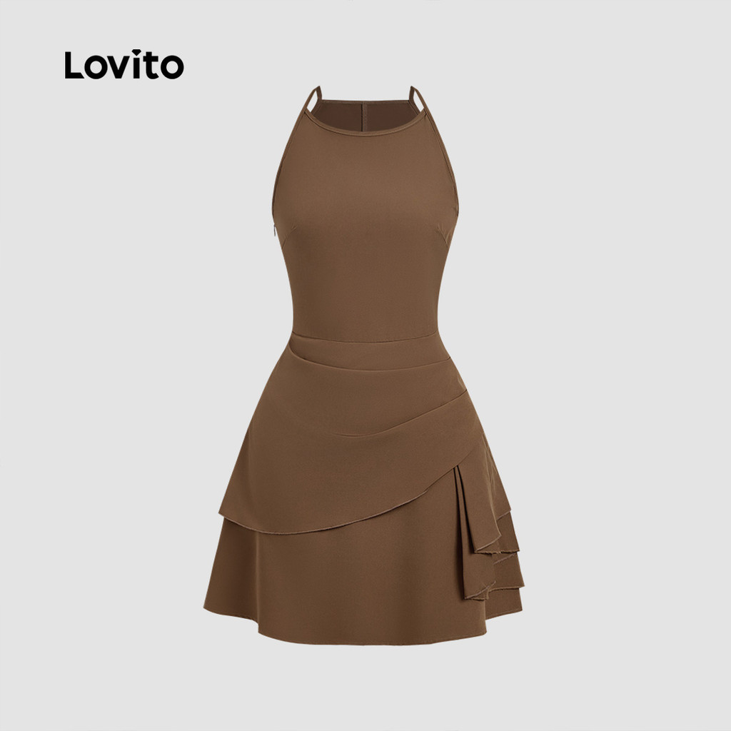 Lovito Vestido Casual Plissado Assimétrico Primavera/verão Marrom para Mulheres L164ED124