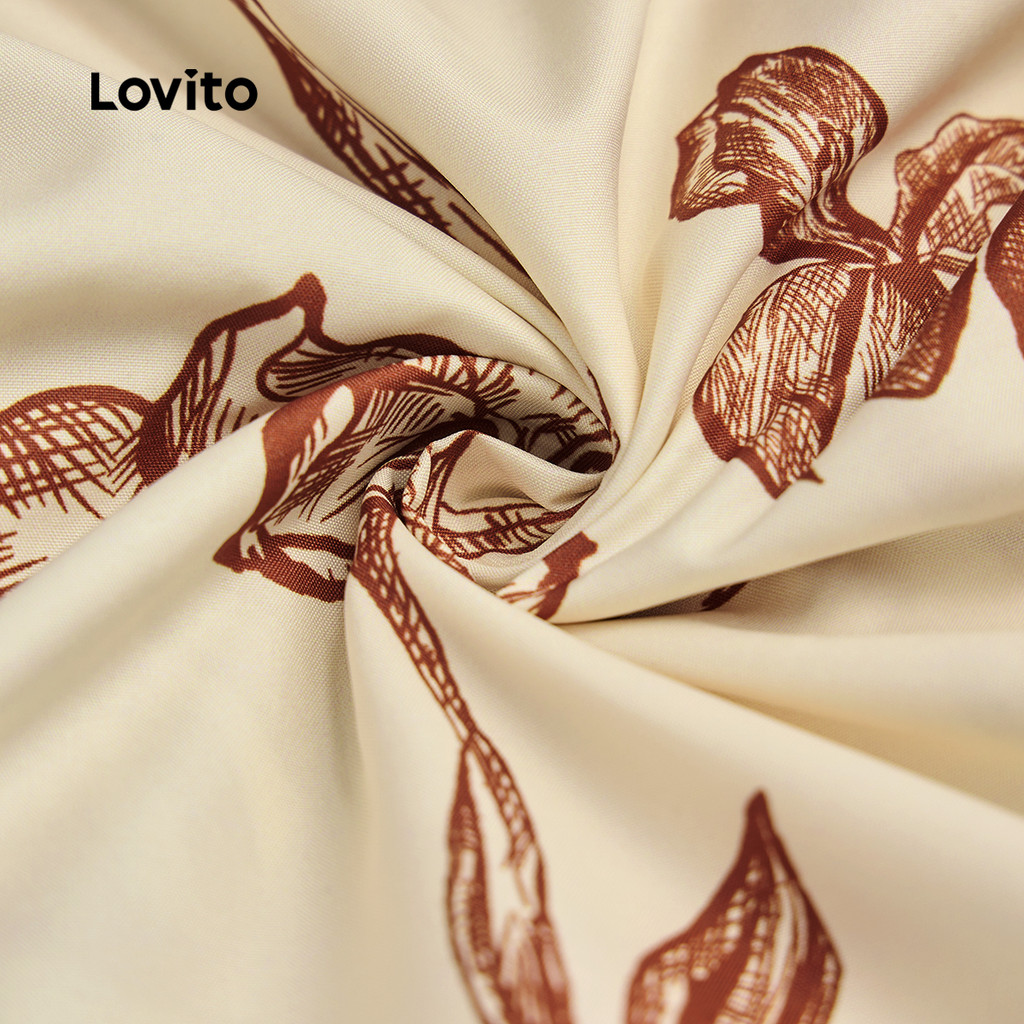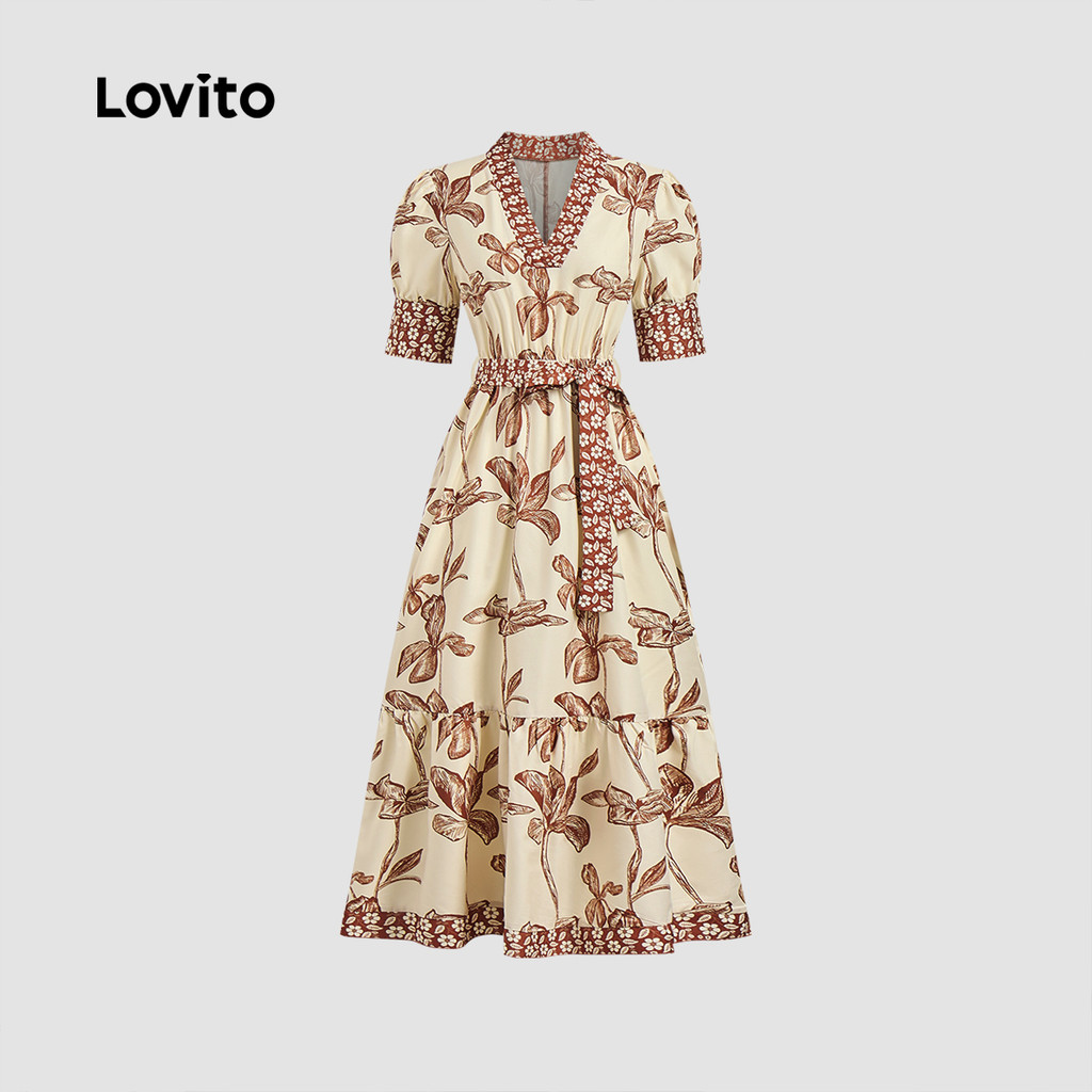 Lovito Refine Vestido Floral Feminino com Cinto para Primavera Verão Marrom LBL25104
