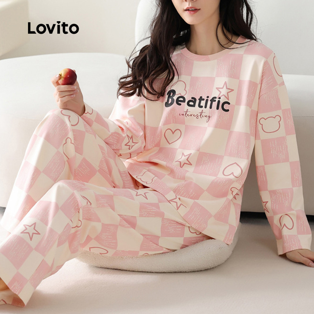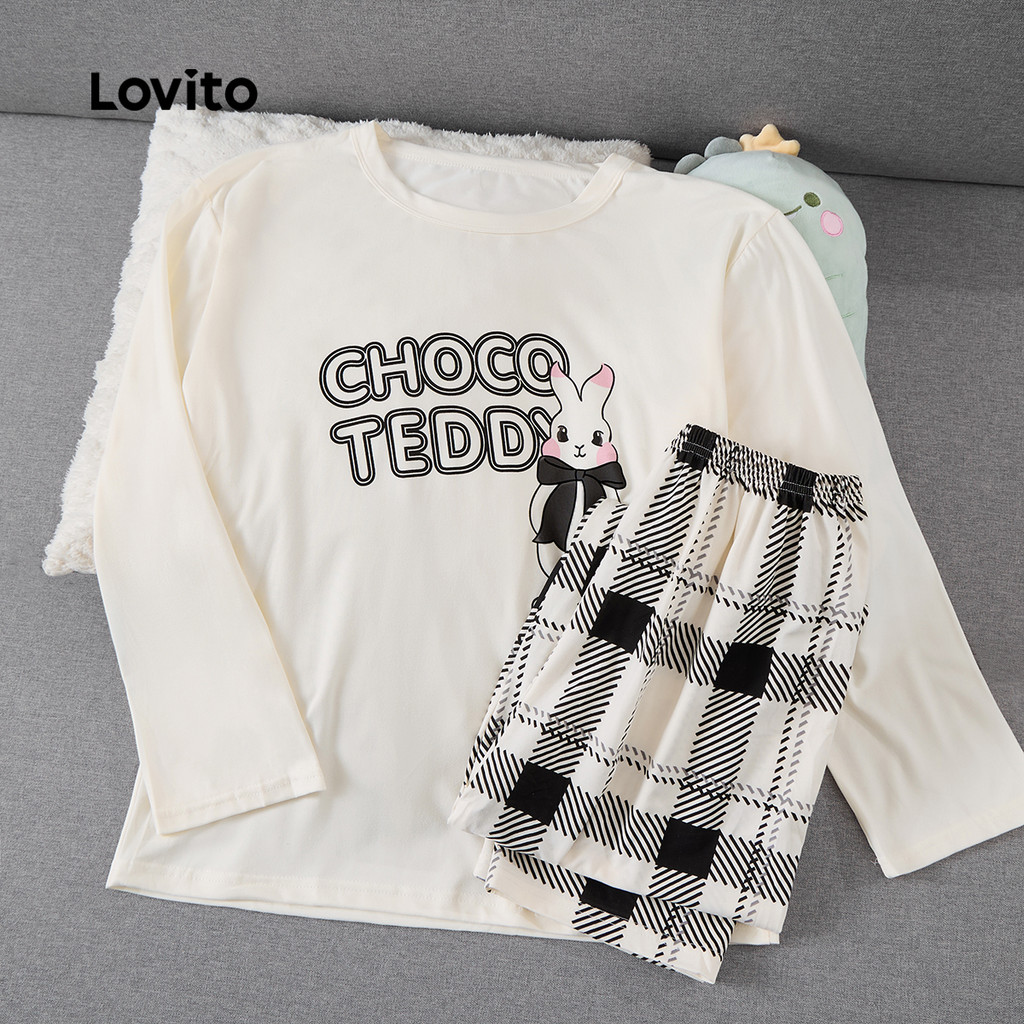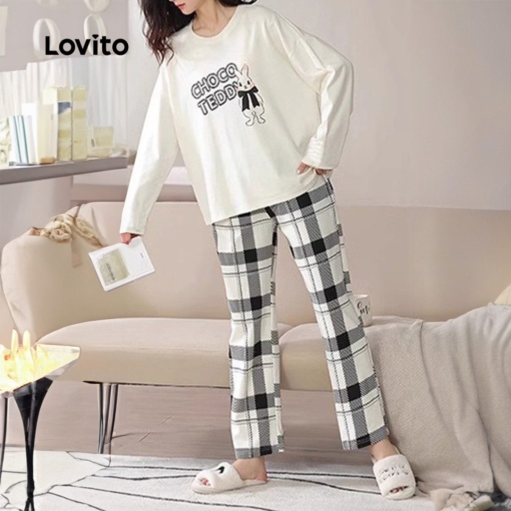 Lovito Conjunto de Pijama Casual 2 Peças Manga Longa Calça Coelho Branco Elegante Confortável para Mulheres LNE126008