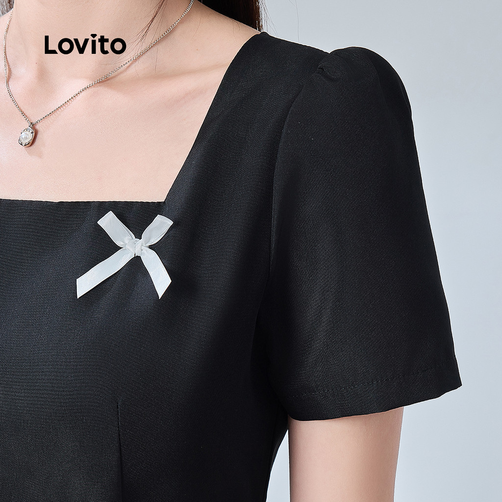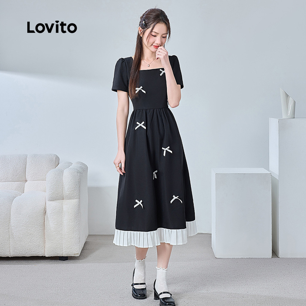 Lovito Vestido Fofo Plissado com Laço Colorido Primavera/verão Preto e Branco para Mulheres. L173AD231