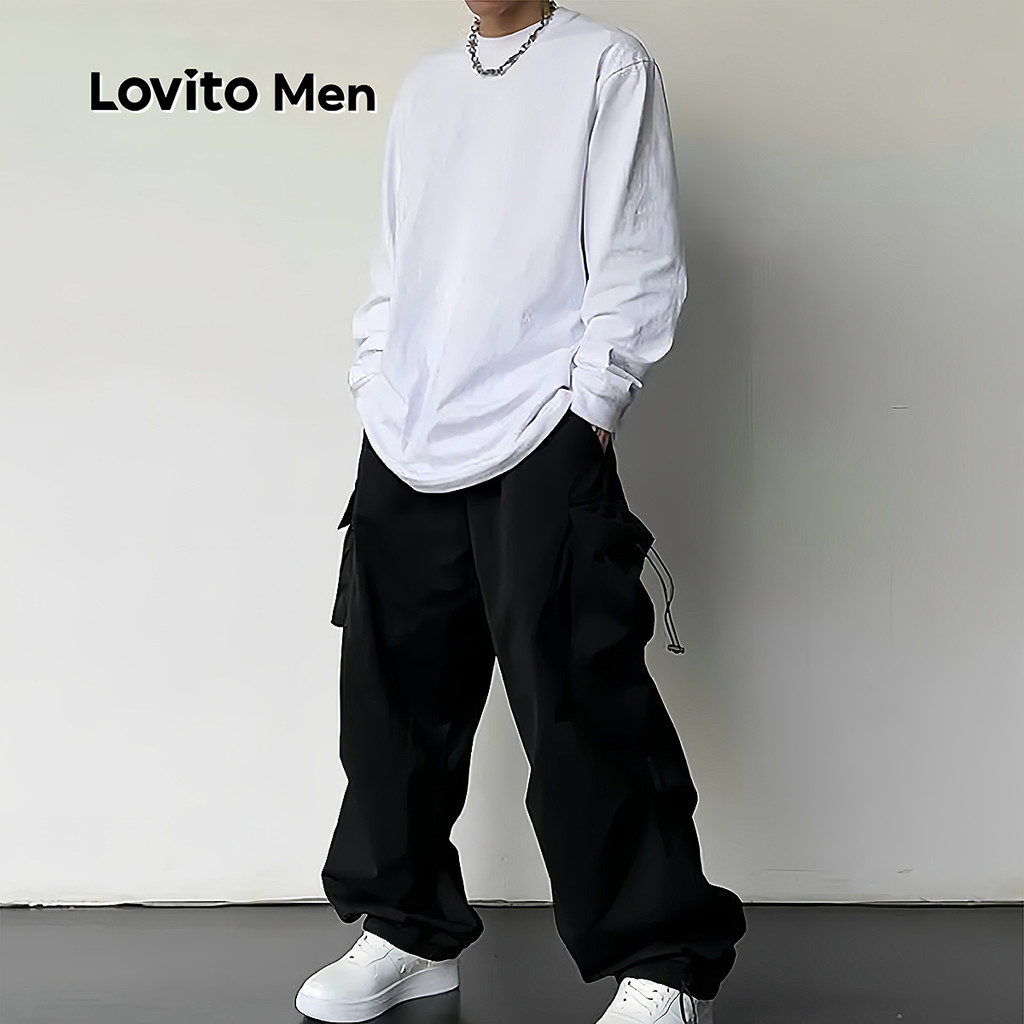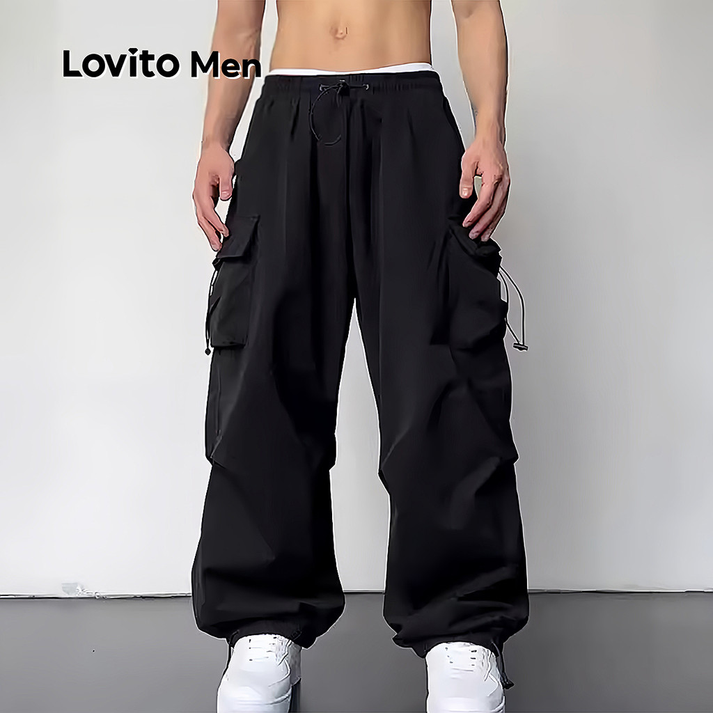 Lovito Men Estrutura Casual de Bolso Cargo com Linha de Amarração para Todas As Estações em Preto LNE118052