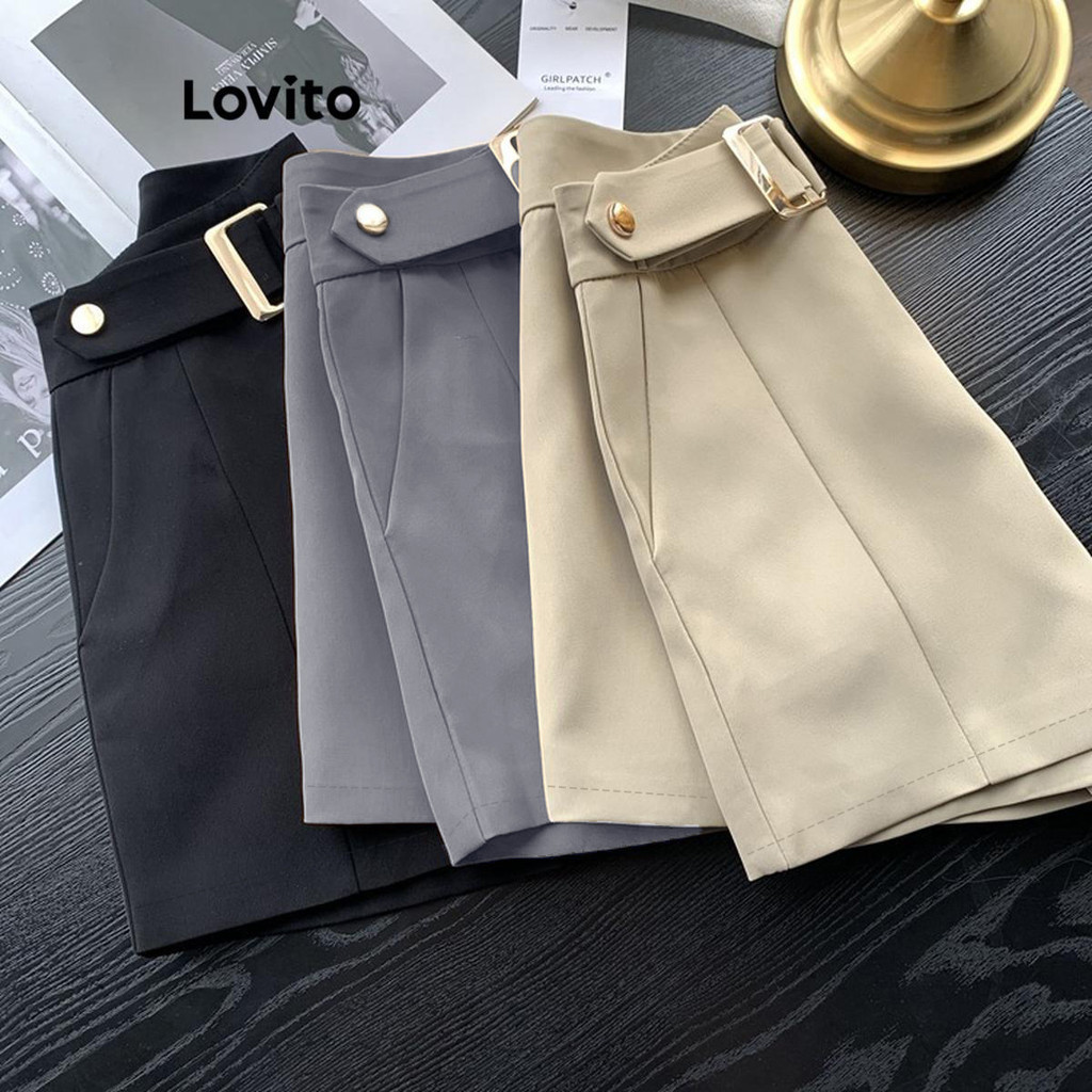 Lovito x Glenda Shorts Casuais De Verão/primavera, Lisos, Assimétricos, Com Bolso De Metal, Para Mulheres LNL48148