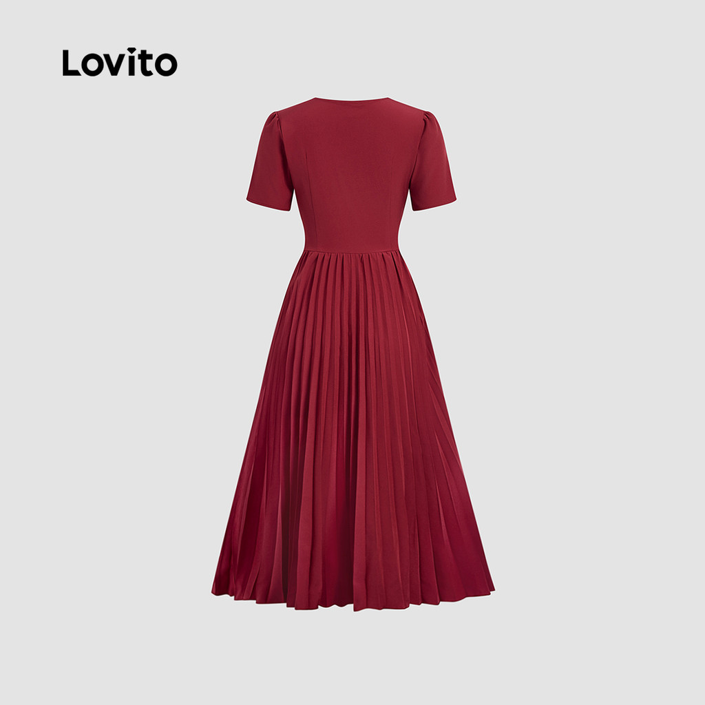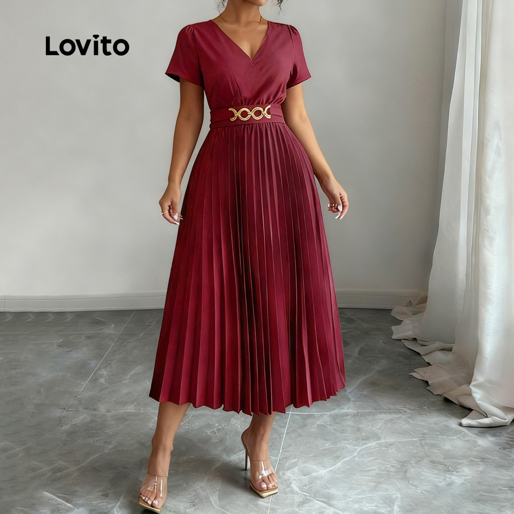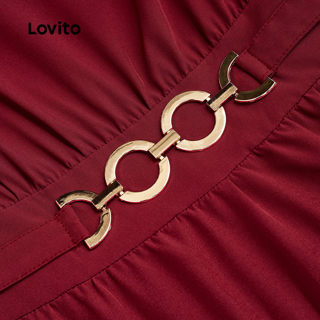 Lovito Vestido Elegante Plissado de Metal para Primavera/verão Vestido Bordô para mulheres LBL31100