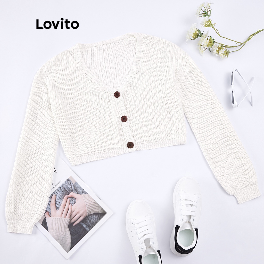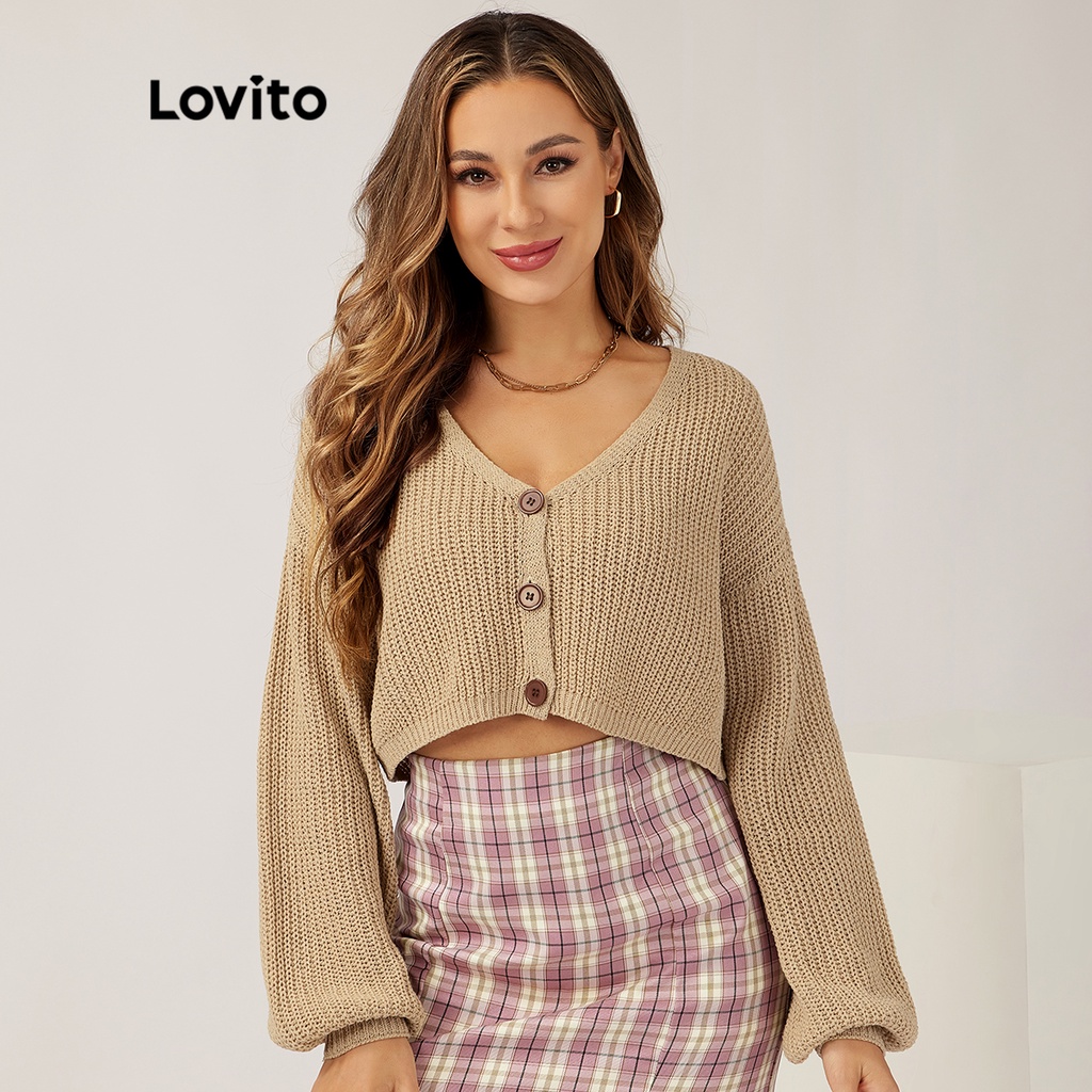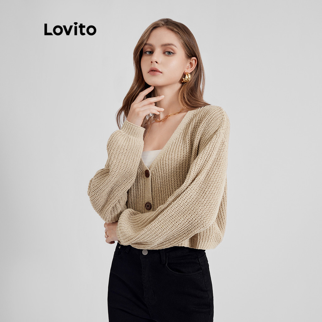 Lovito Cardigans Lisos Manga Longa Com Botões E Tricot Para Mulheres L21LT091 (Caqui/Branco)