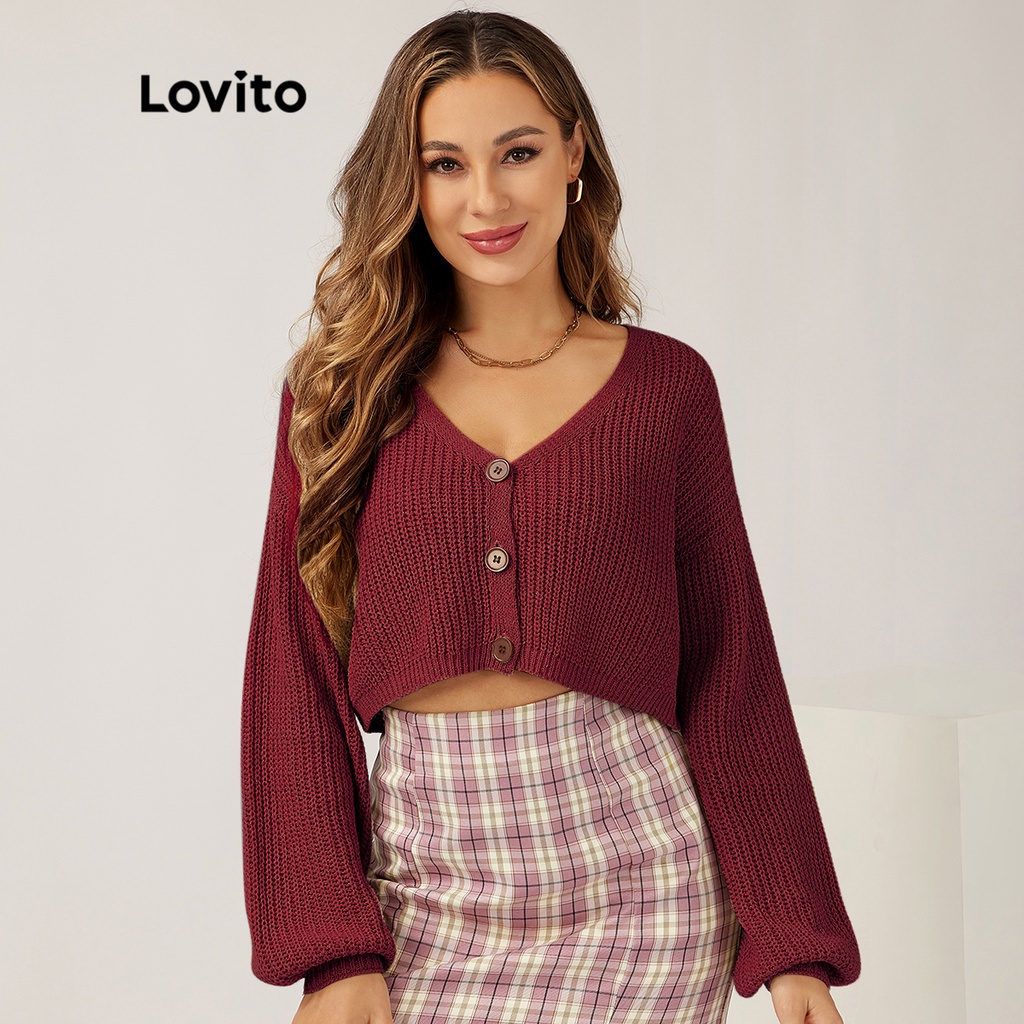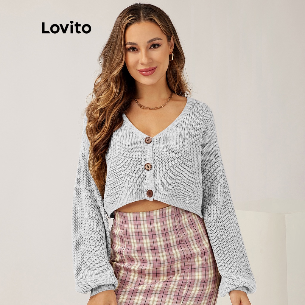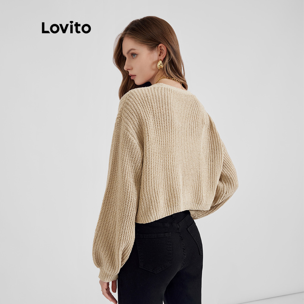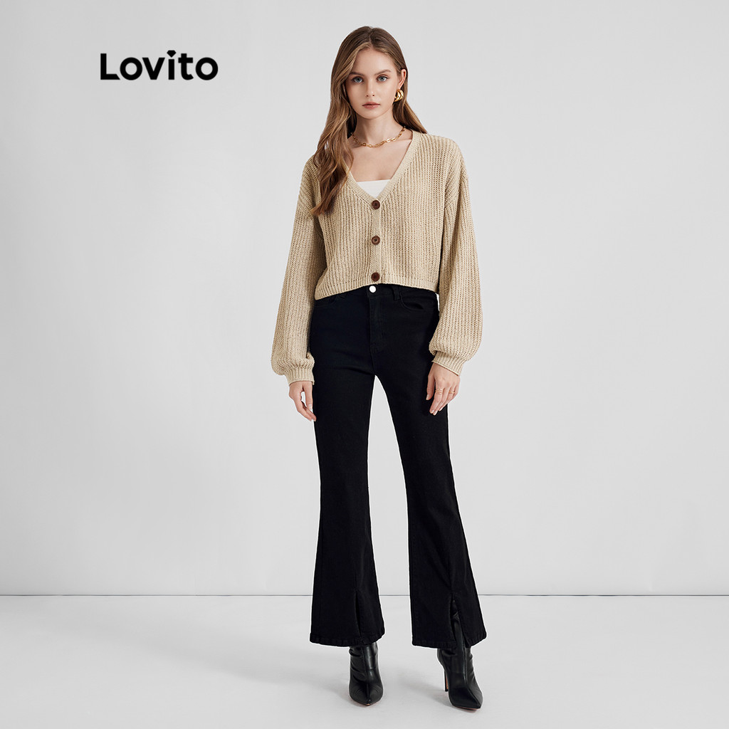 Lovito Cardigans Lisos Manga Longa Com Botões E Tricot Para Mulheres L21LT091 (Caqui/Branco)