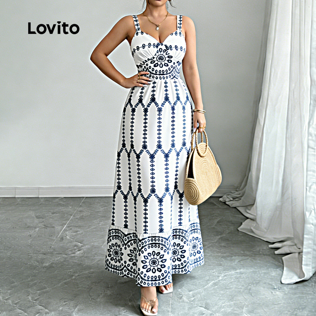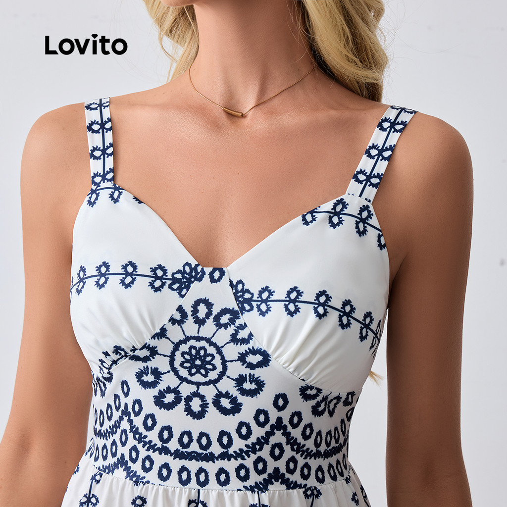 Lovito Refine Vestido Feminino Longo Boho Étnico Azul Estampado Primavera Verão com Zíper LBL32064