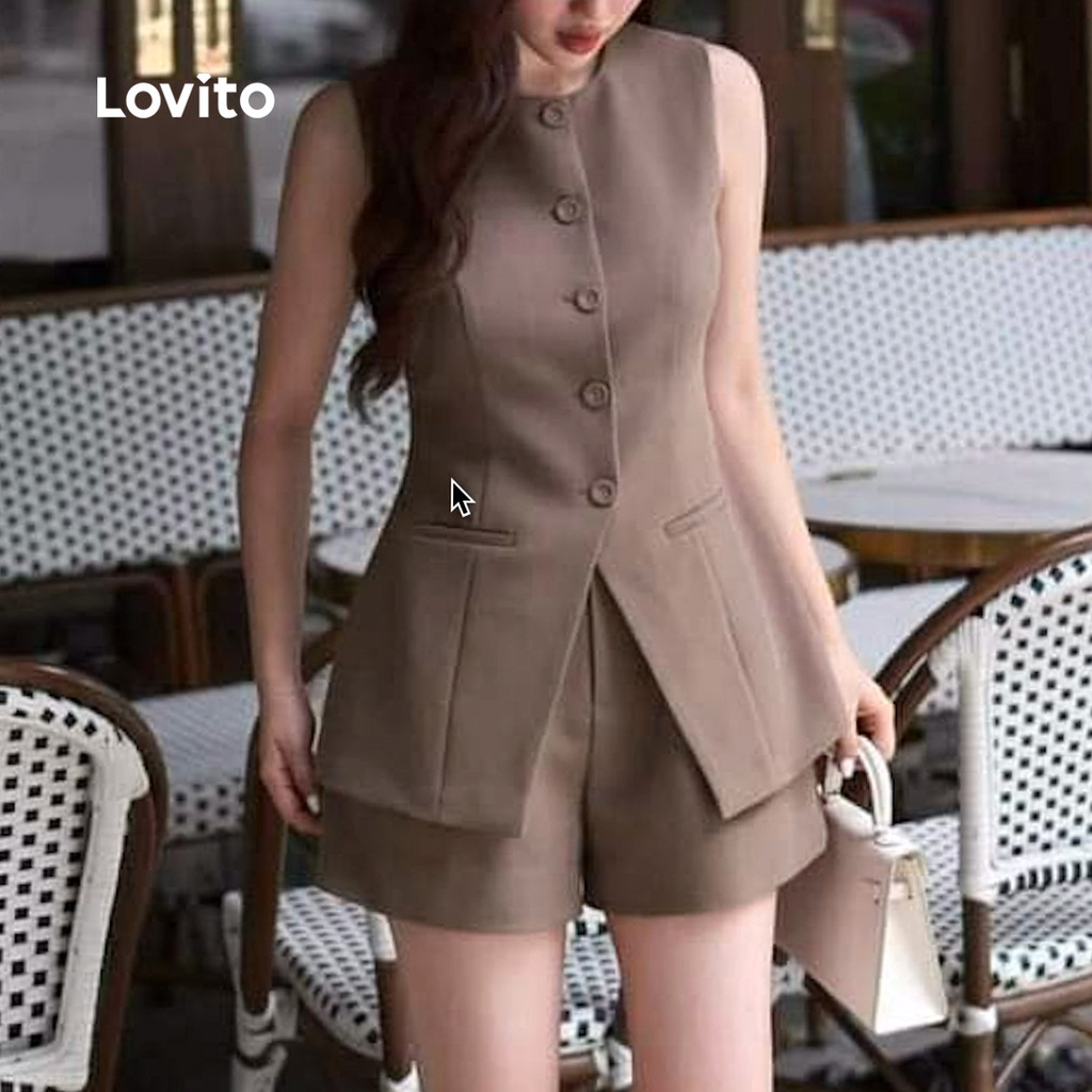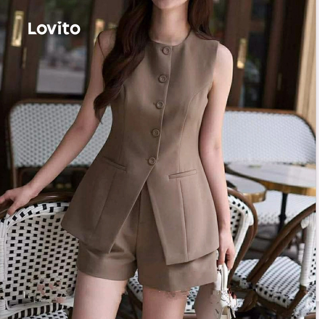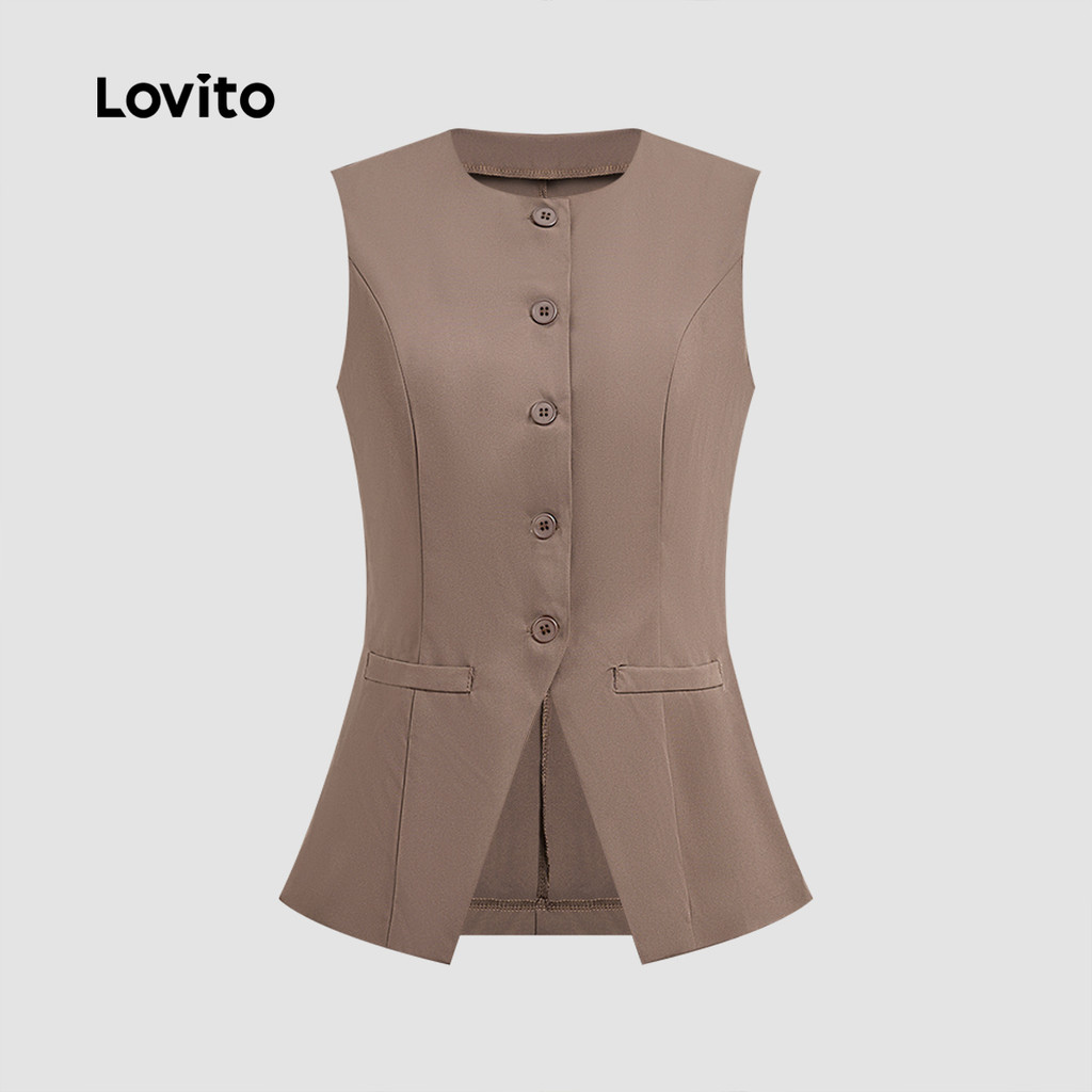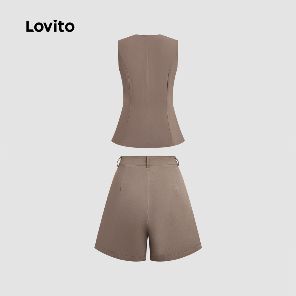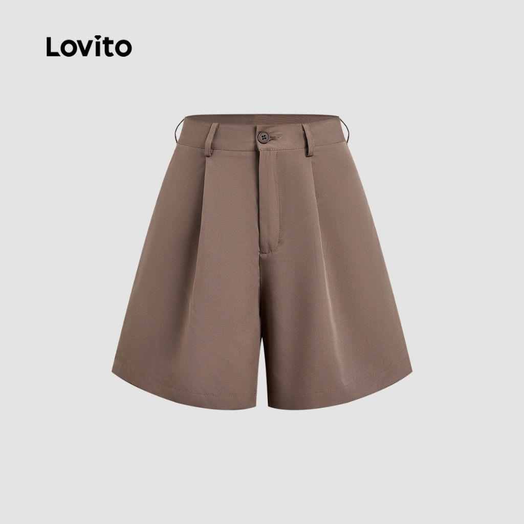 Lovito Abotoada Plissada Primavera/verão Blusa Marrom Tops ou Bottoms para Mulheres. L172LD321