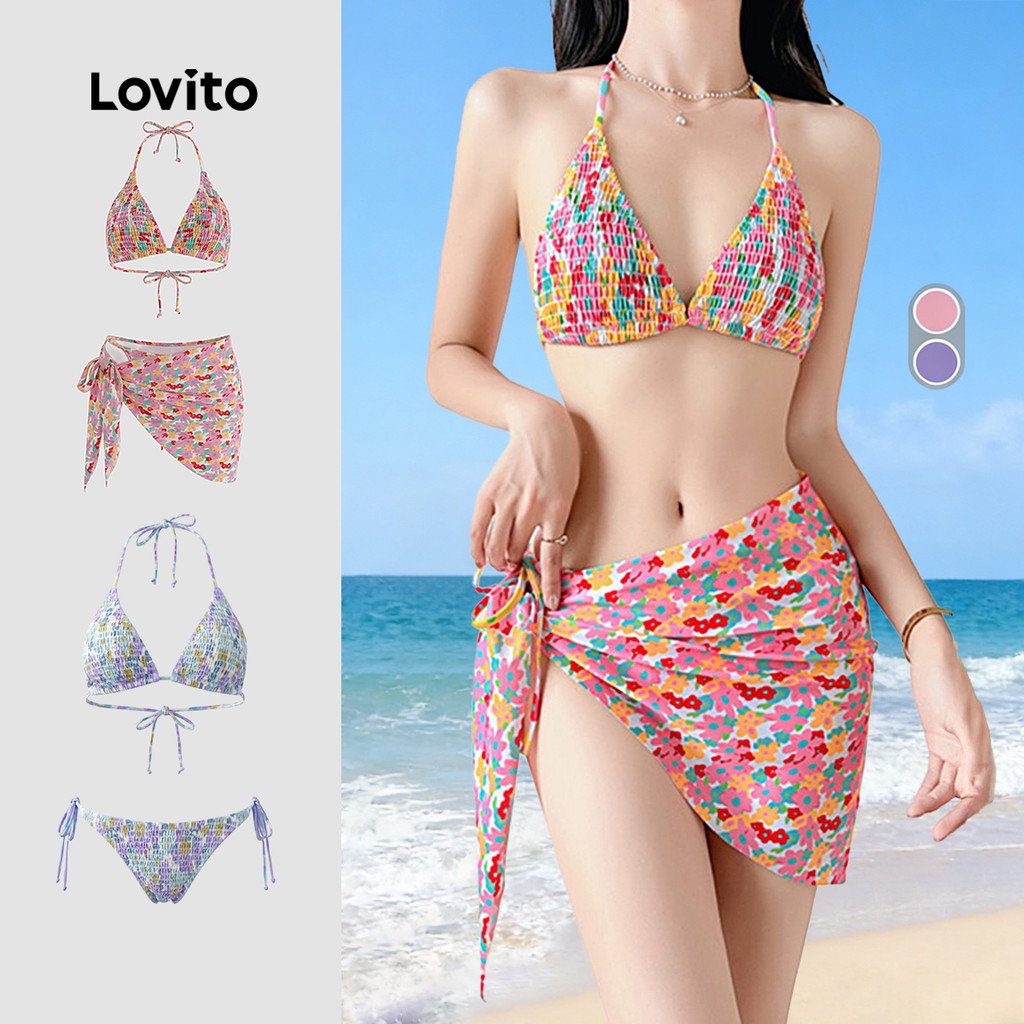 Lovito Conjuntos de Biquíni Boho com 3 Padrões Plissados Azul Primavera/verão para Mulheres LNE141X015