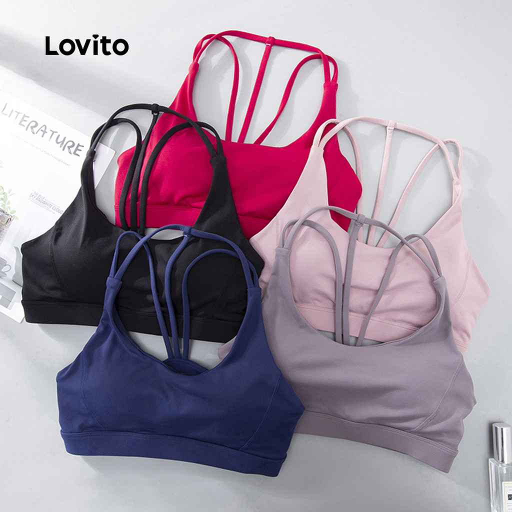 Lovito Sutiã Esportivo Elástico Push Up Yoga Fruncido Anti-Impacto Costas Bonitas Corrida Fitness LNL77167\3