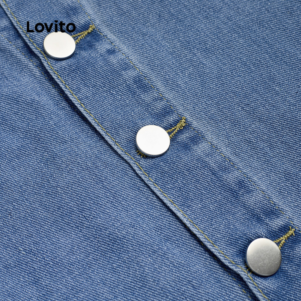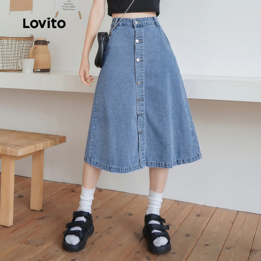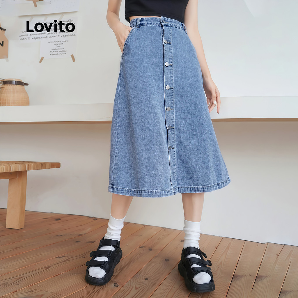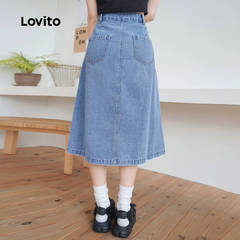 Lovito Saias de Ganga Casuais Lavadas Botão Frontal Bolso Primavera/verão Saias de Ganga Azuis para Mulheres L177ED198