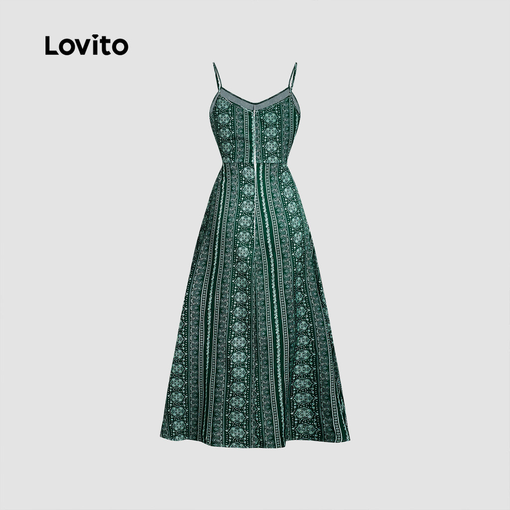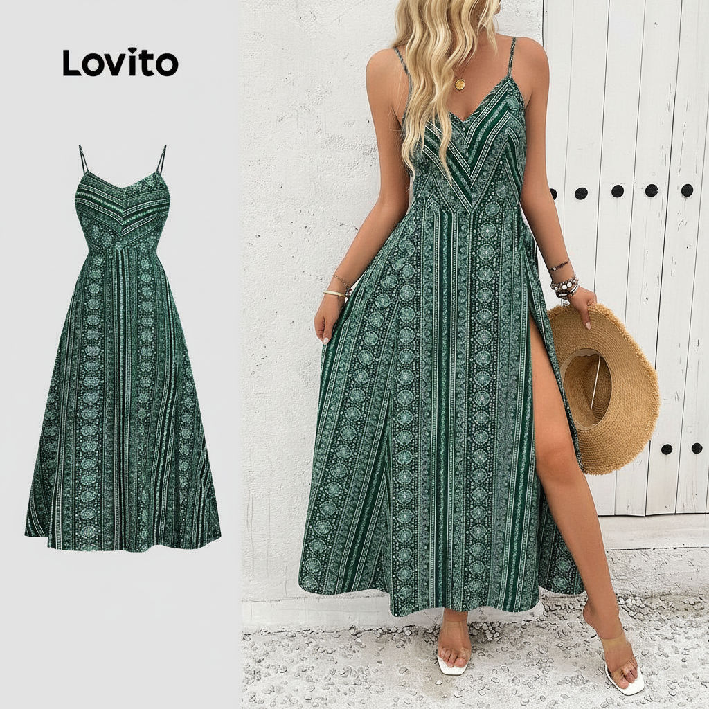 Lovito Vestido Feminino Estilo Boho Abertura Frontal Verde Estação Quente LBL31091