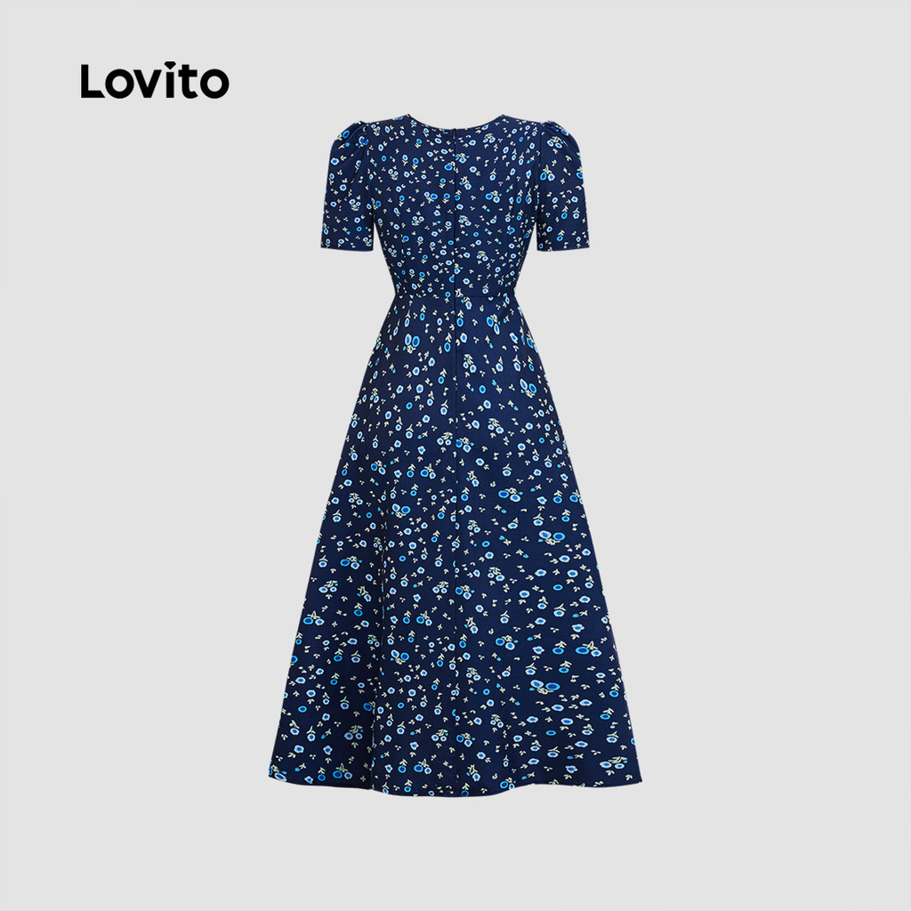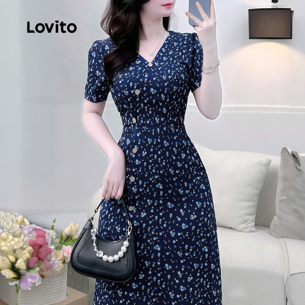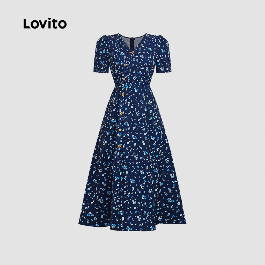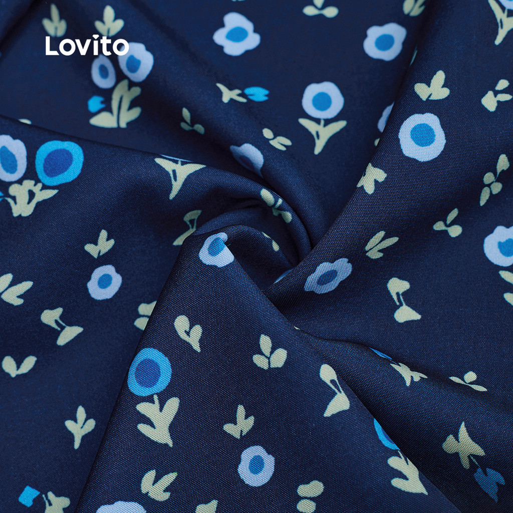 Lovito Vestido Casual Com Estampa Floral Corte Assimétrico E Botões Azul Marinho Primavera/verão Feminino L165ED1012