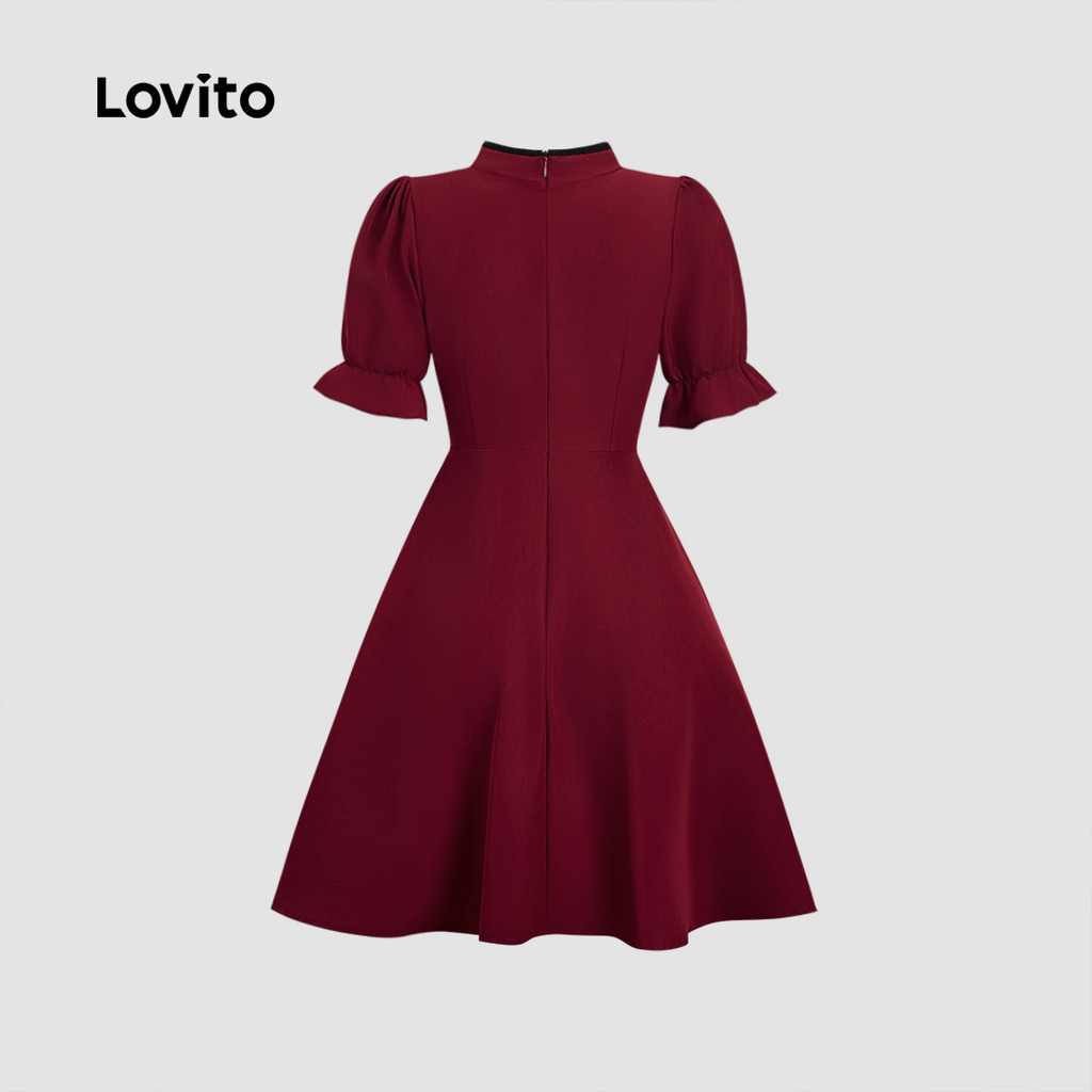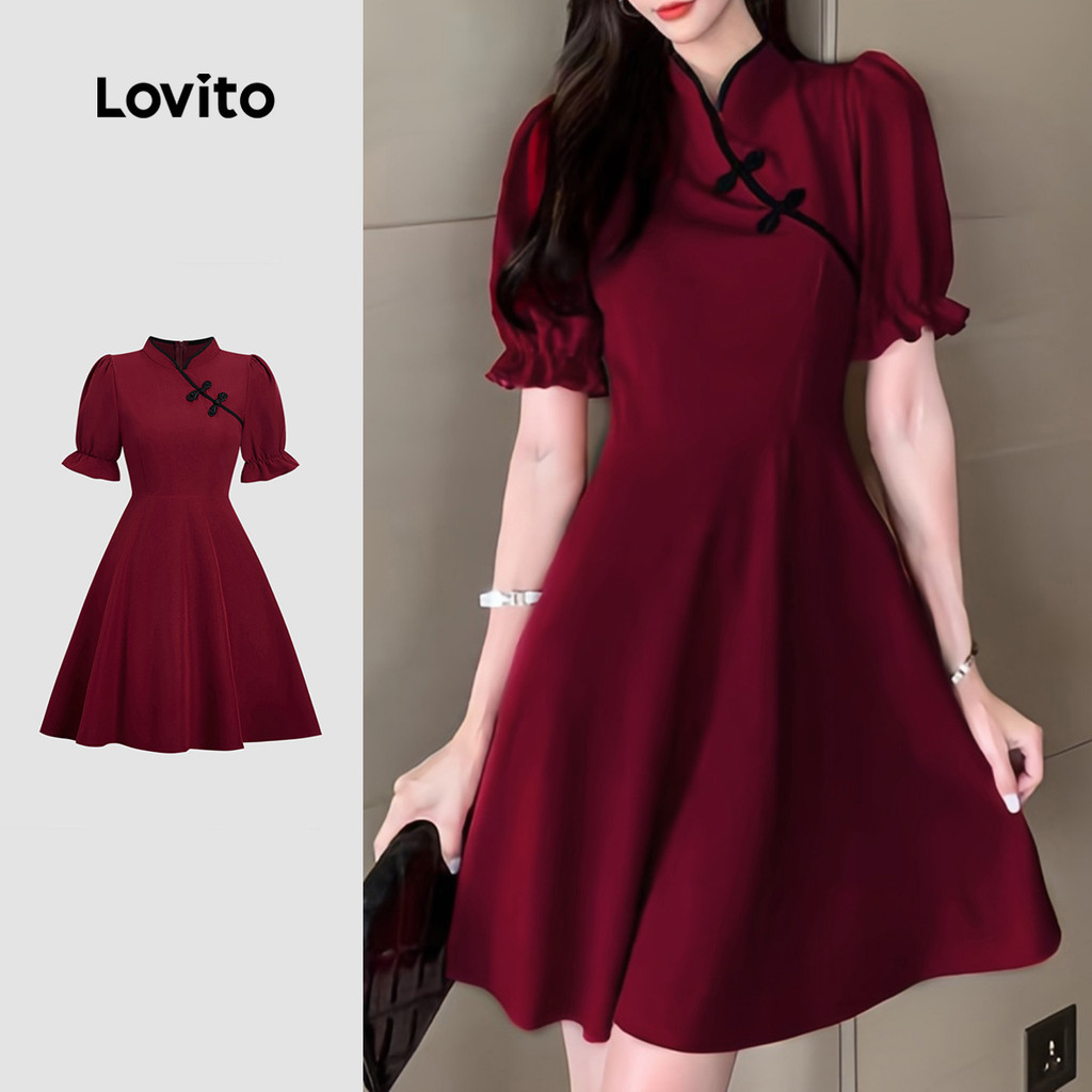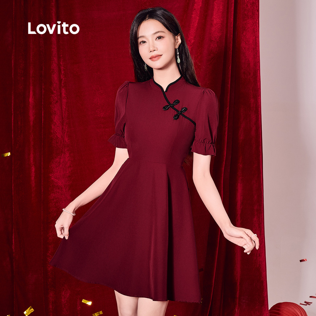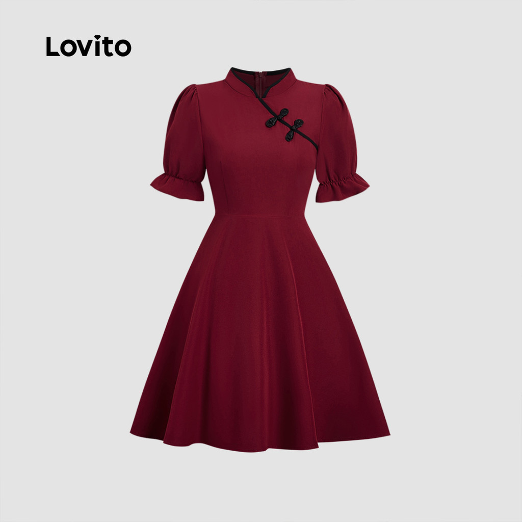 Lovito Vestido Elegante com Contraste de Acabamento Estilo Chinês Novo Primavera/verão Vestido vermelho L165ED164