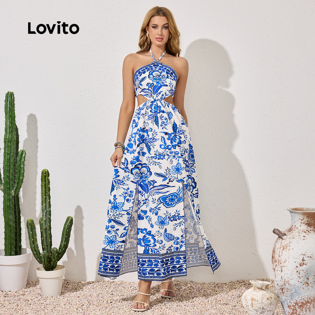 Lovito Vestido Boho Feminino Floral com Recorte para Verão Primavera LBL22257