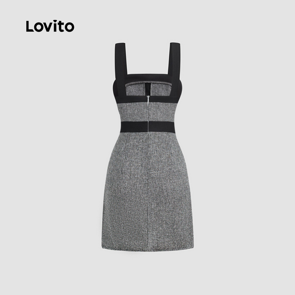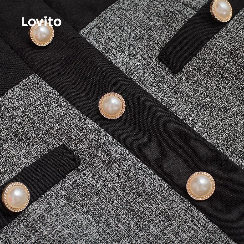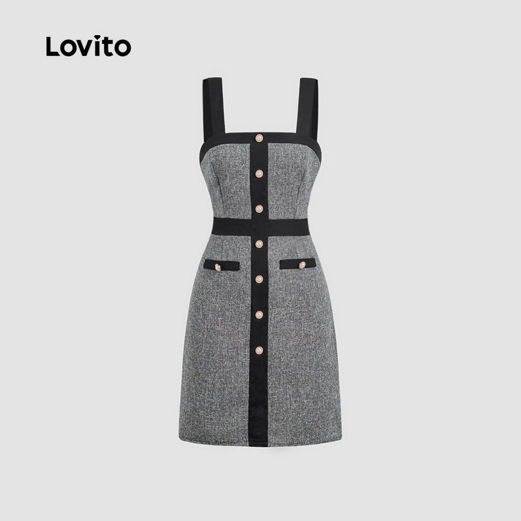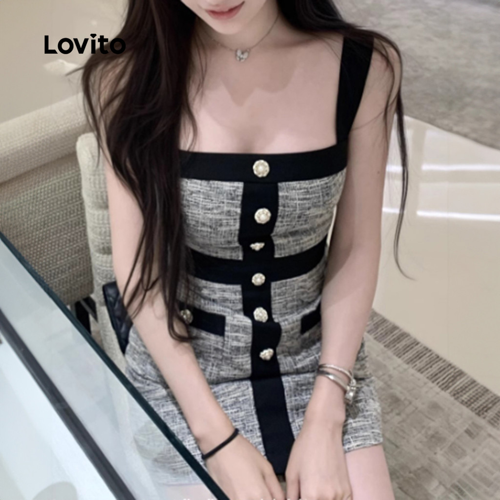 Lovito Vestido Sofisticado de Cores Blocos com Botões Primavera Verão Vestido Preto Feminino L155ED1447