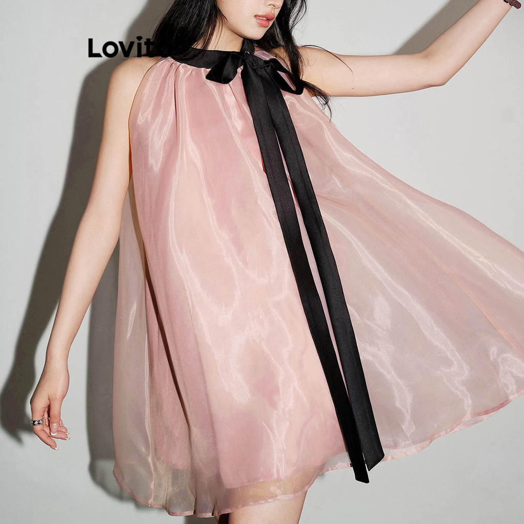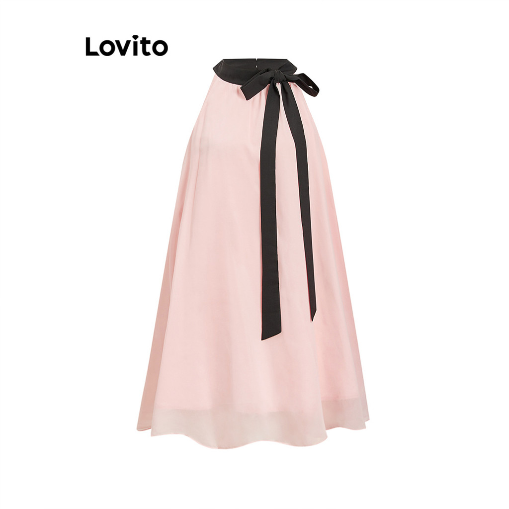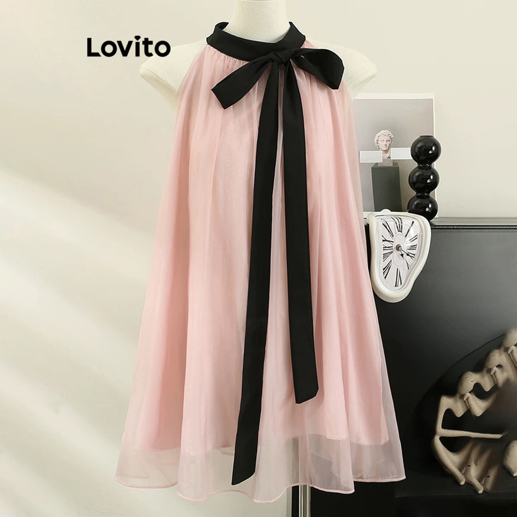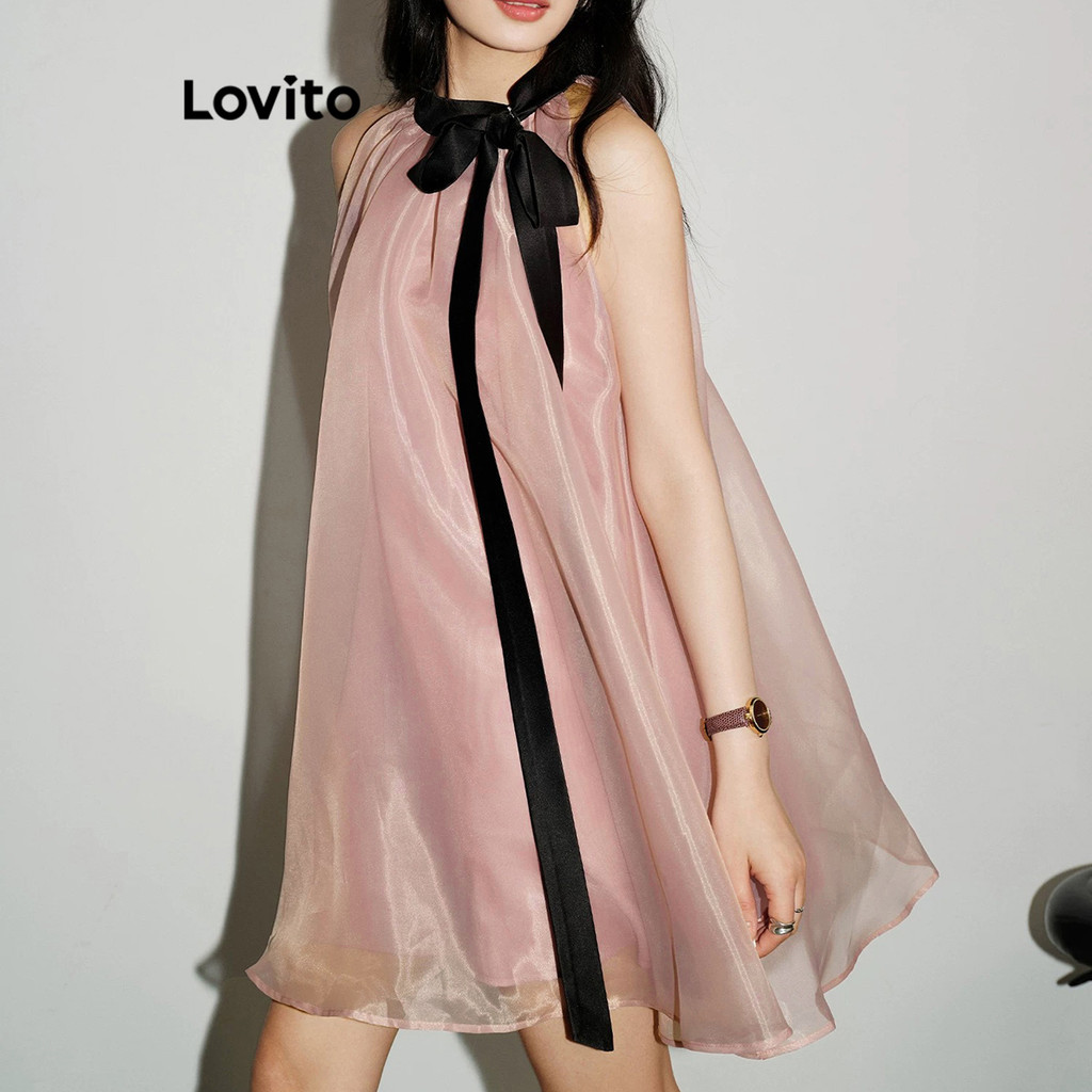 Lovito Vestido Feminino Casual Liso Dupla Camada Com Gola E Laço Frontal L109MD177