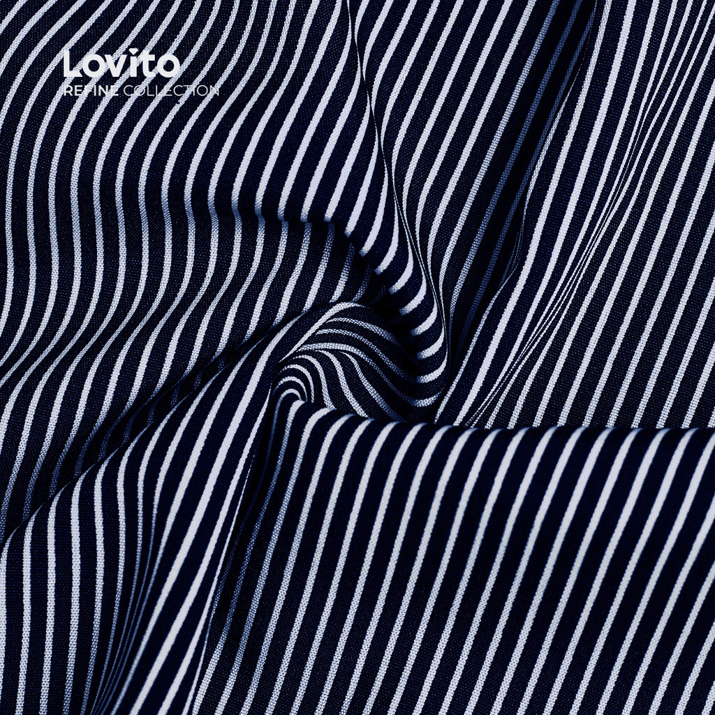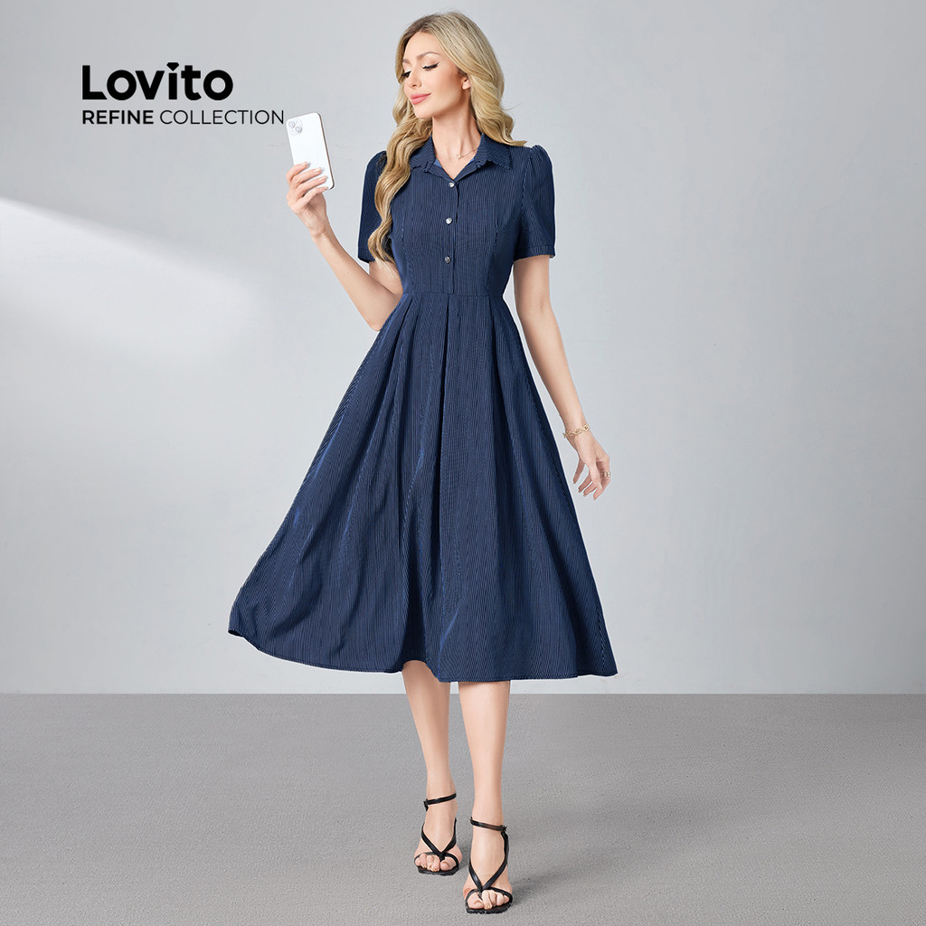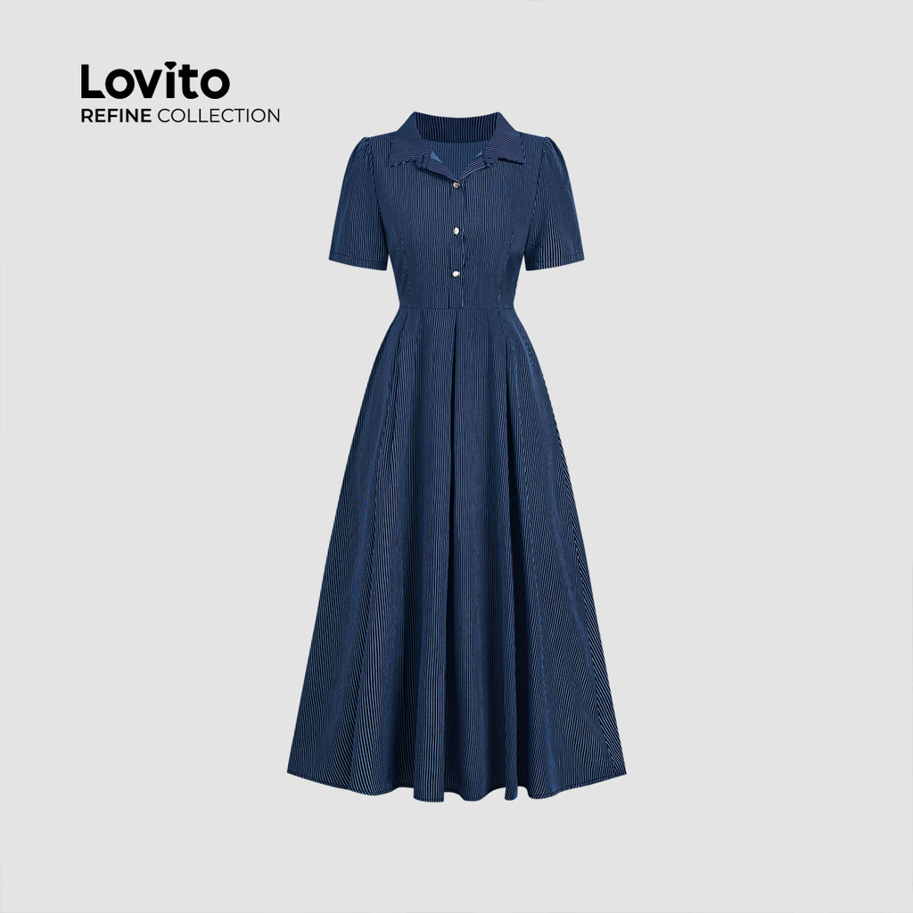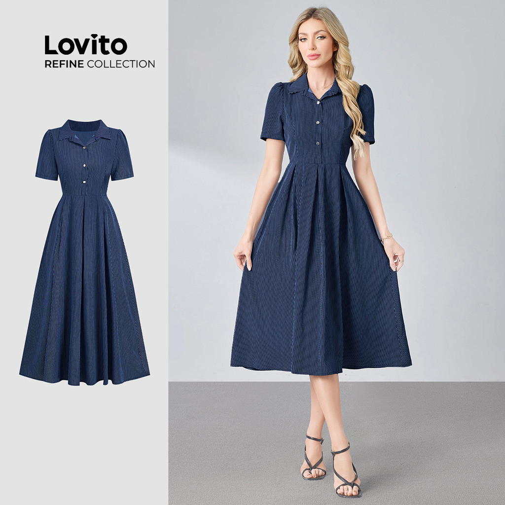 (Lovito Refine) Vestido Elegante Evangélico Botões Frontais Zíper Azul Escuro Primavera/verão Para Mulheres LR23L066