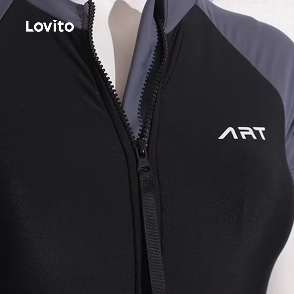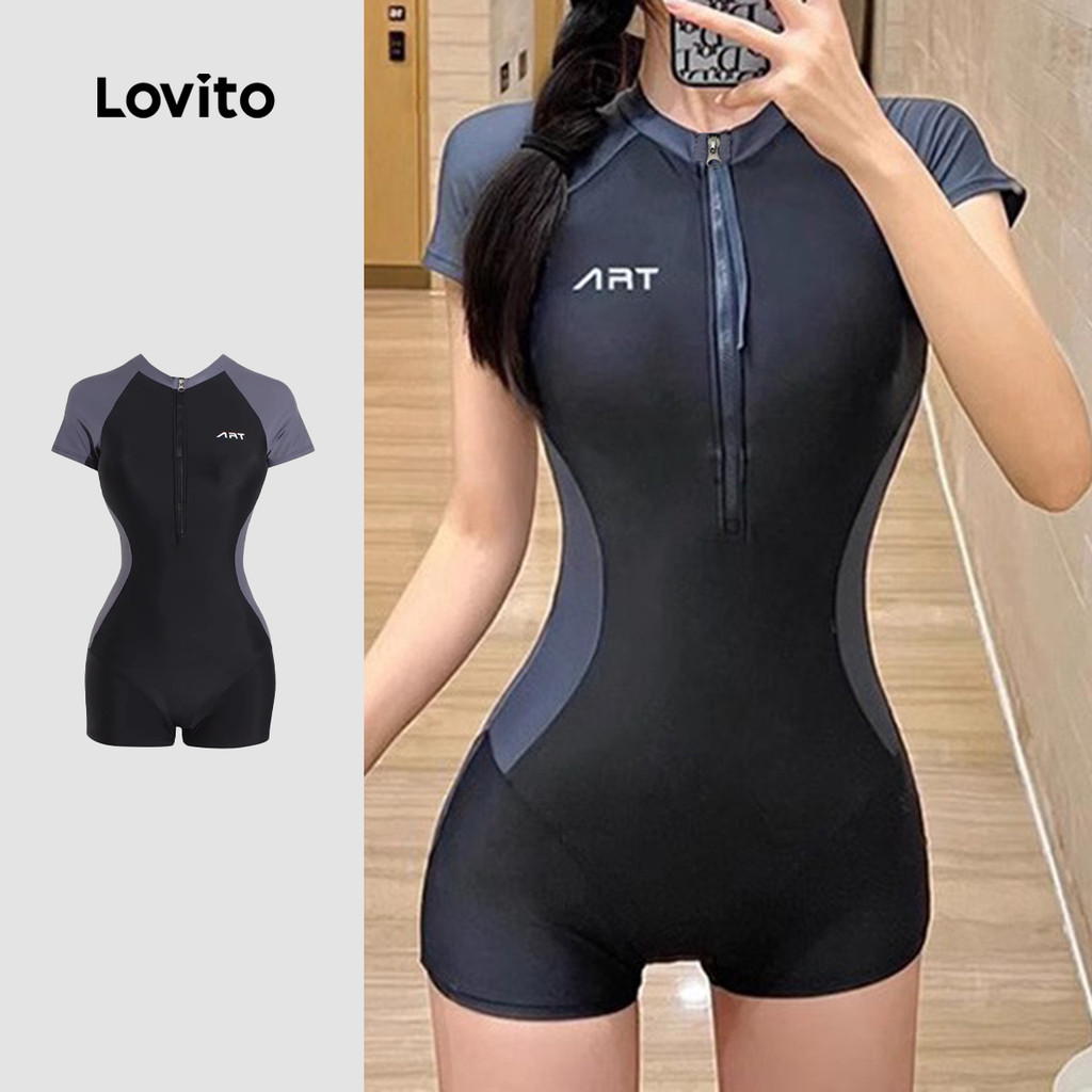Lovito Maiô Onepiece Esportivo Colorblock Primavera/verão Preto Maiô Onepiece para Mulheres LNE126026