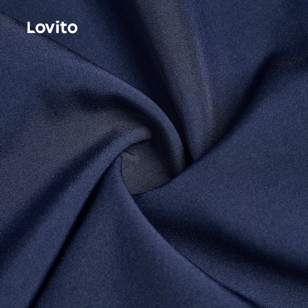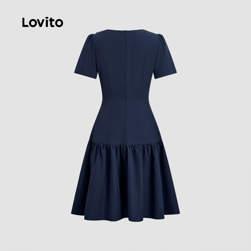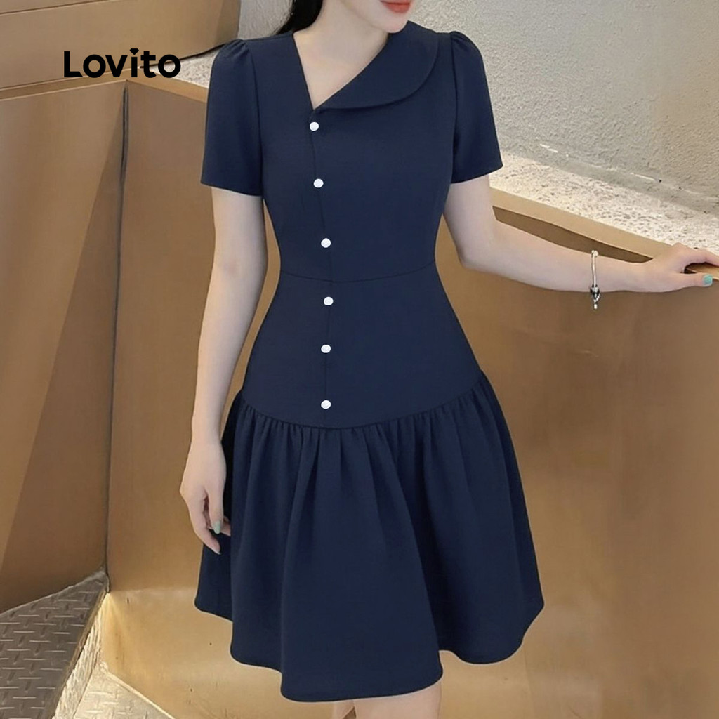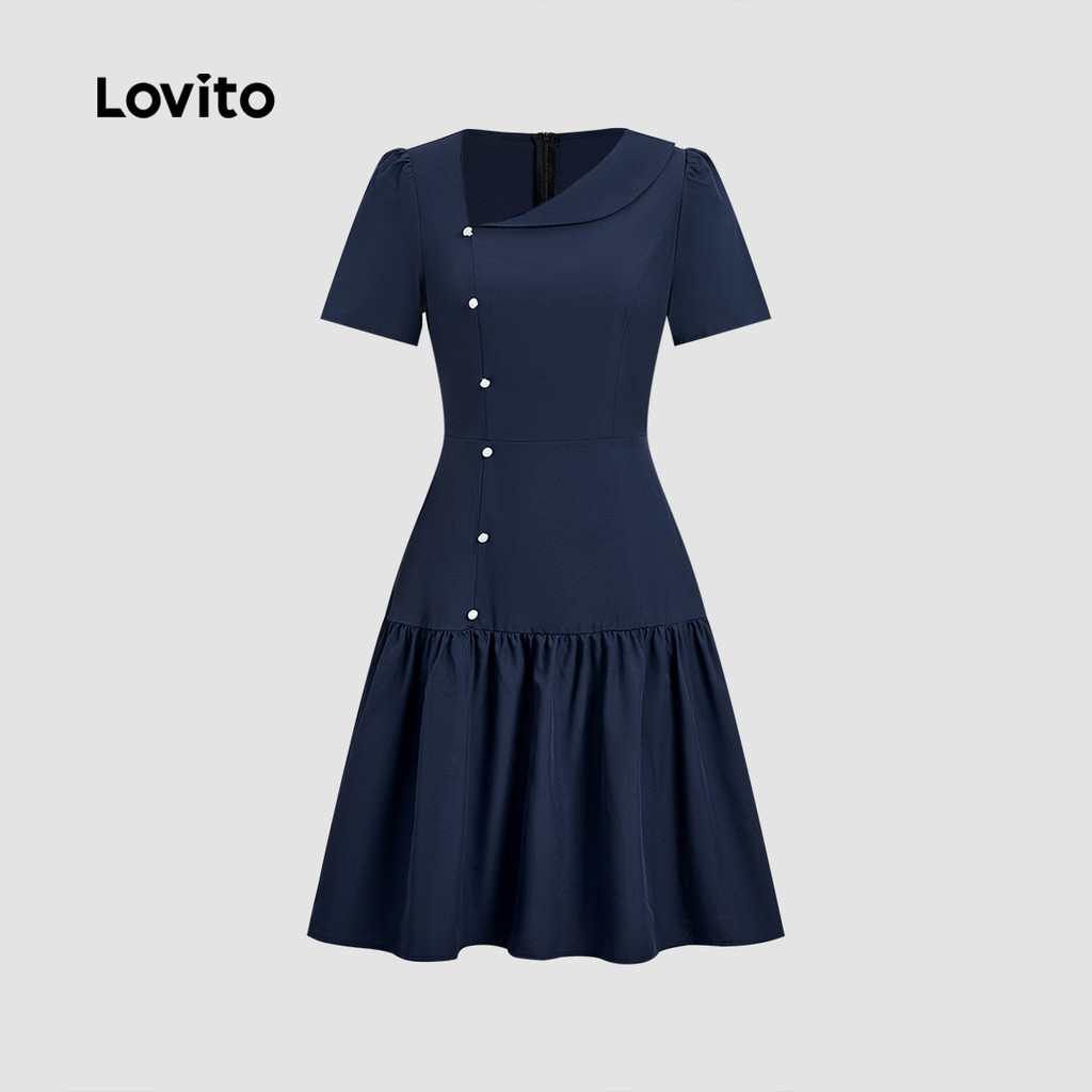 Lovito Vestido Elegante Botão Assimétrico Frente Babado Bainha Primavera/verão Azul Marinho para Mulheres L172LD1952