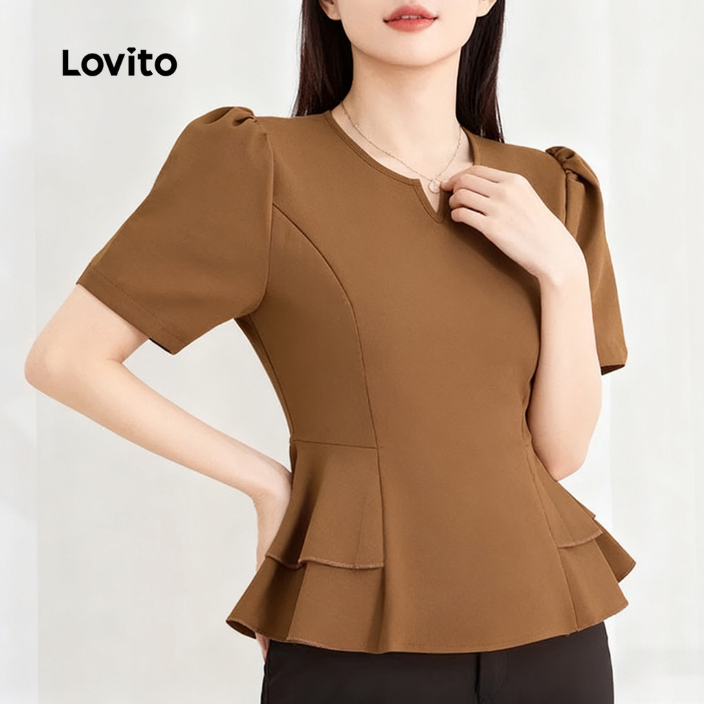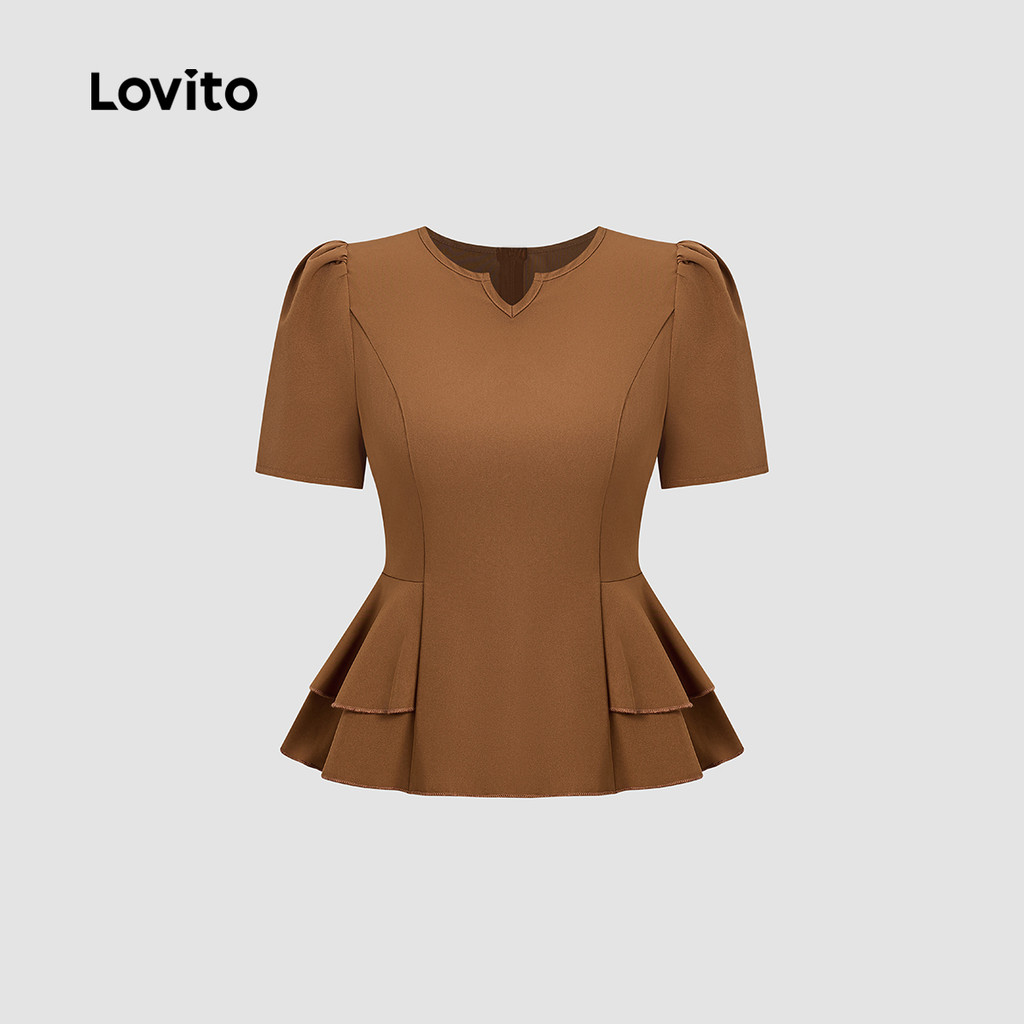 Lovito Blusa Elegante Simples Versátil Babados Na Barra E Camada Dupla Primavera/verão Marrom para Mulheres L157ED218