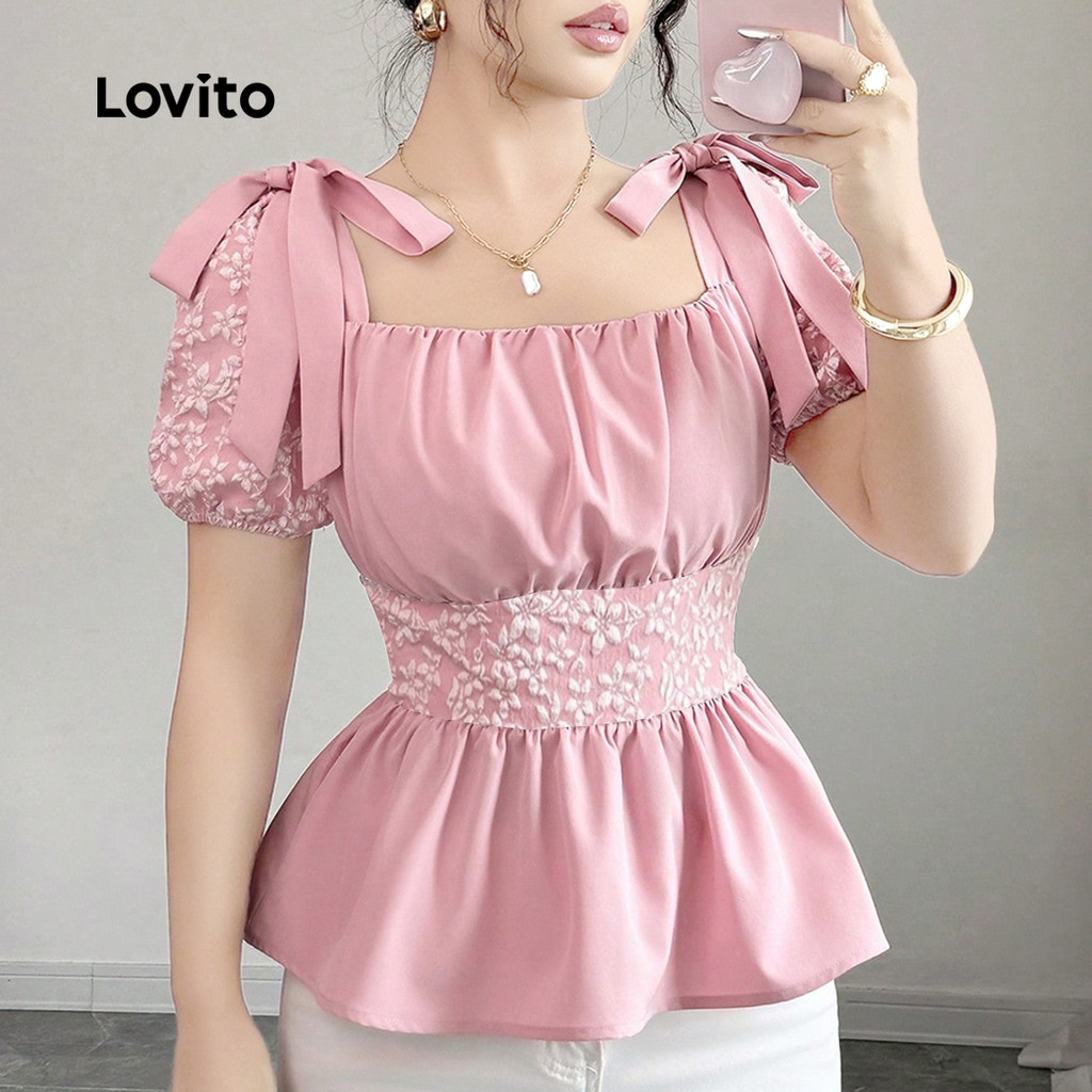 Lovito Blusa Elegante Jacquard com Laço Primavera/verão; Blusa Rosa para mulheres L158ED515
