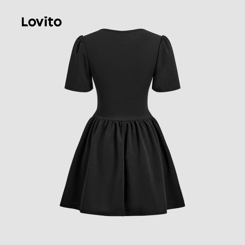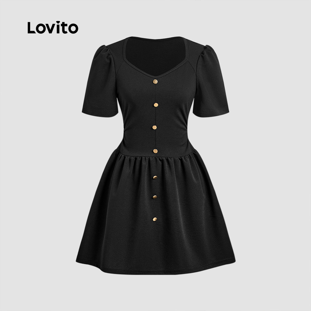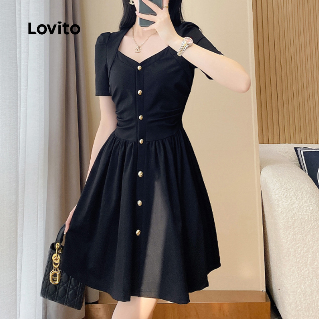 Lovito Refine Vestido Elegante Botão Primavera Verão Feminino Preto L143ED158