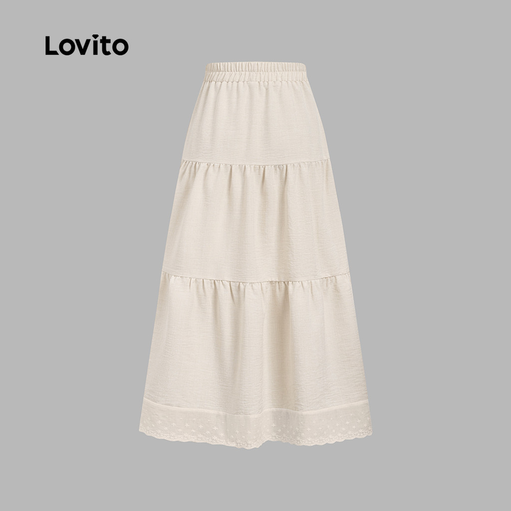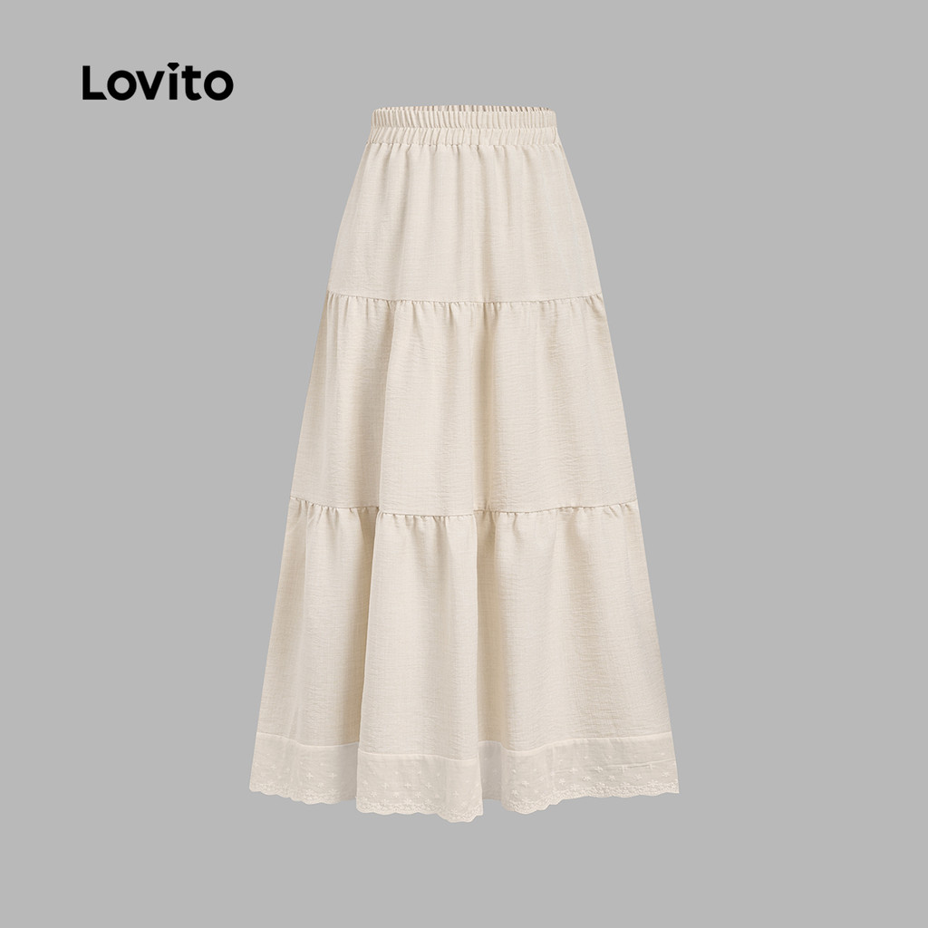 Lovito Saia Longa Casual De Linho Com Bordado Camadas De Renda Cor Damasco Ideal Para Primavera/verão LBL32087