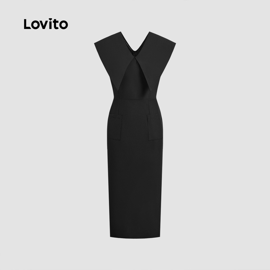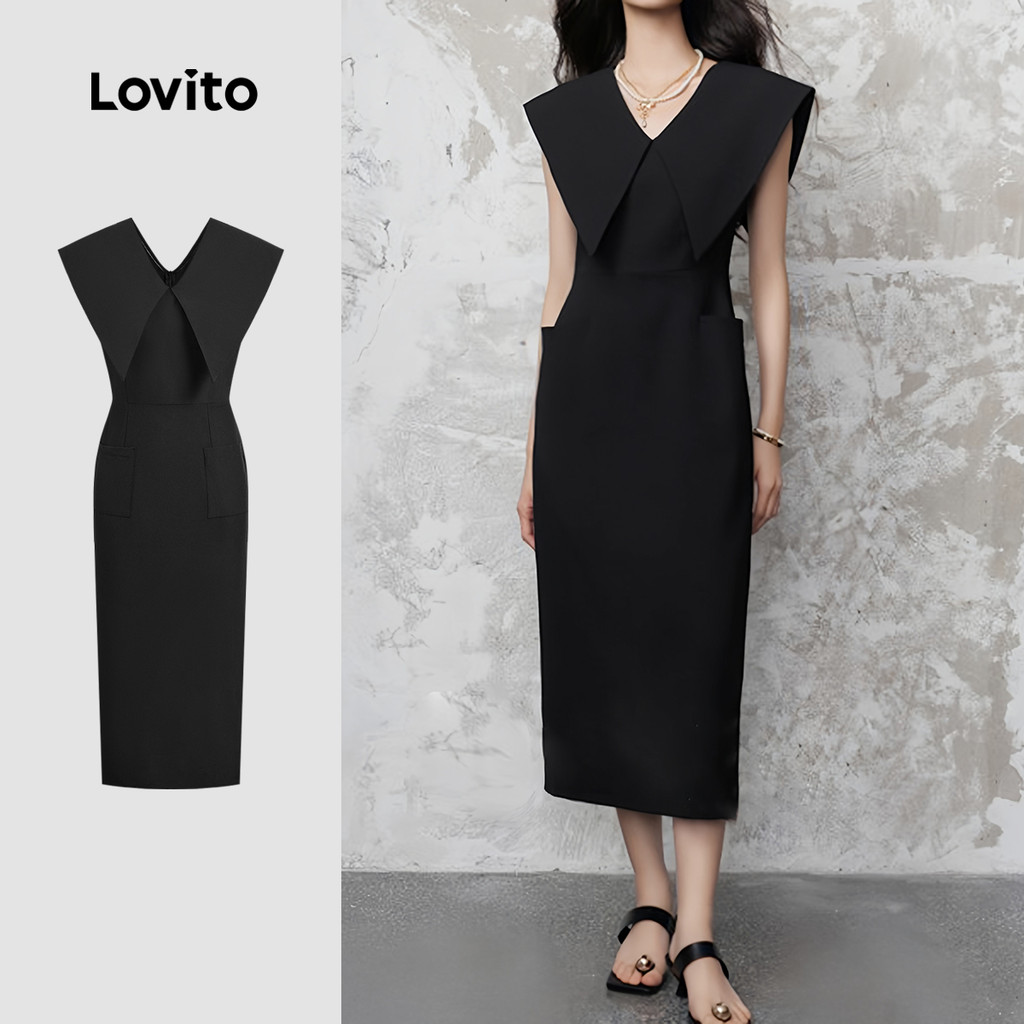 Lovito Refine Vestido Elegante Retro para Trabalho com Bolso Primavera/verão Preto para Mulheres L142ED694
