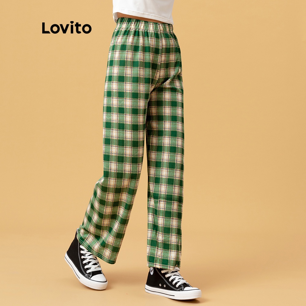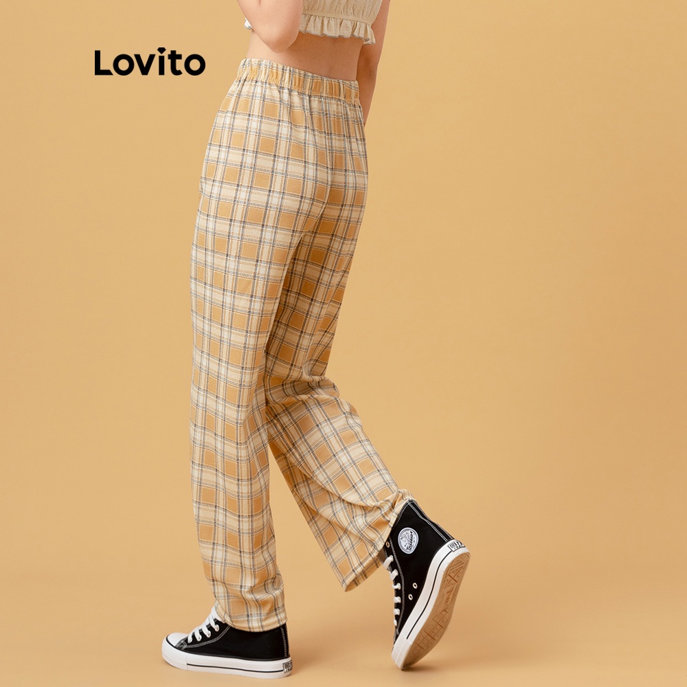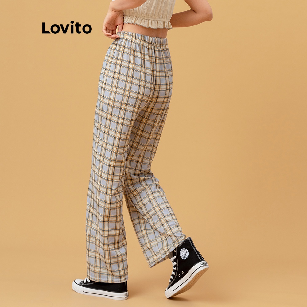 Lovito Calças Casuais Perna Reta Xadrez Cintura Elástica Verão/Primavera Calças Para Mulheres L00270