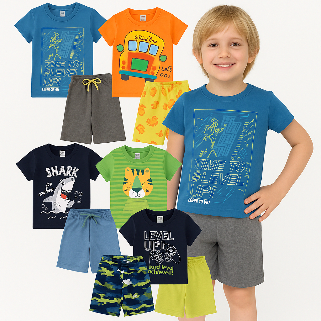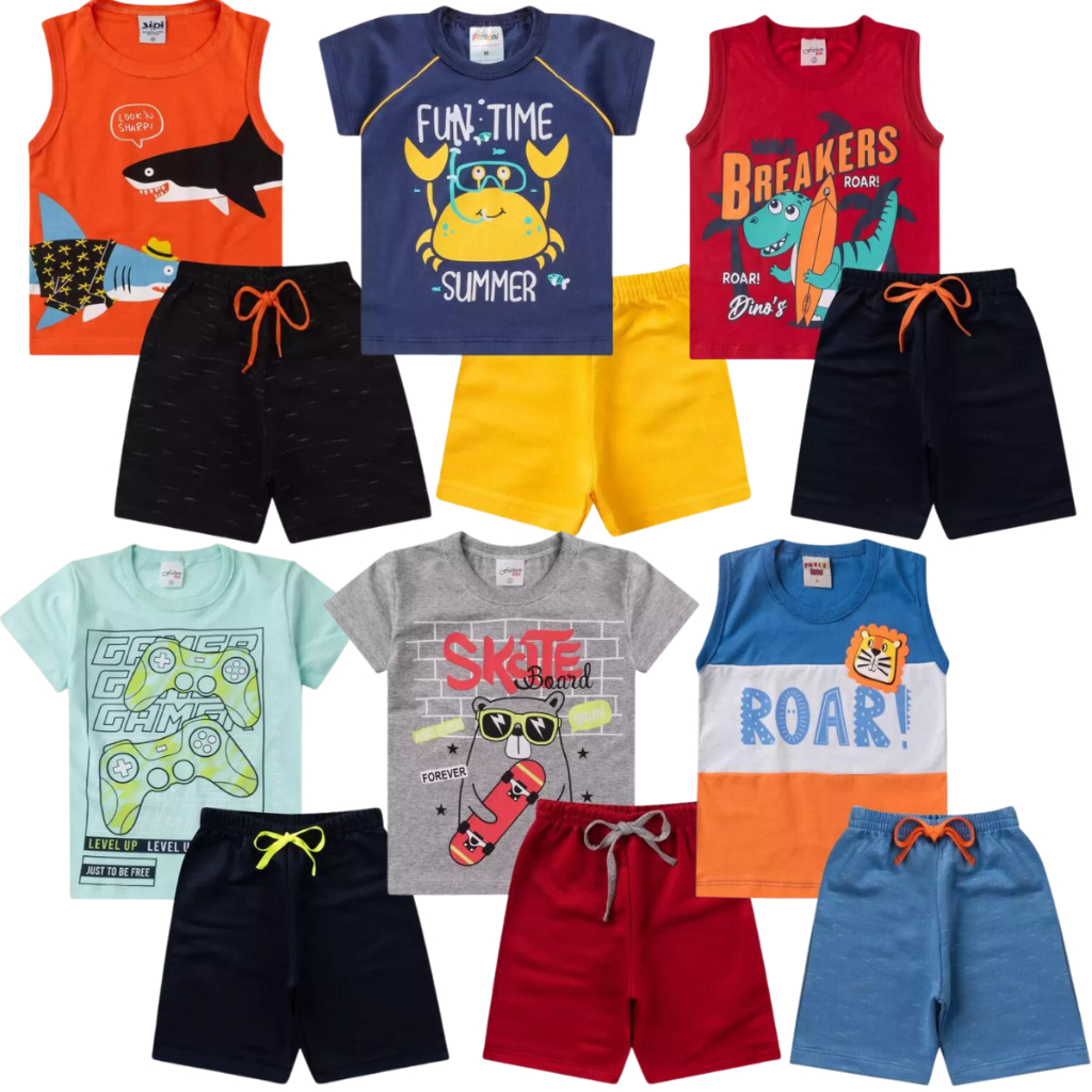 Kit 6 Peças Roupa Infantil Masculino 3 Camisetas 3 Shorts - Promoção - Kit com 3 ou 1 Conjuntos