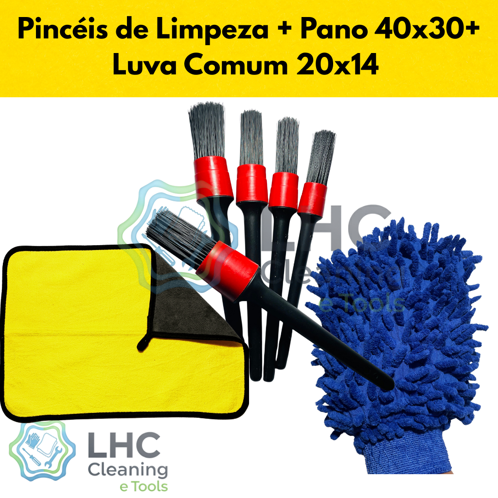 Kit Limpeza Automotiva 05 Pincéis limpeza Automotivas + Flanelas Toalhas Panos Microfibra 40x30 60x30 + Luva Microfibra