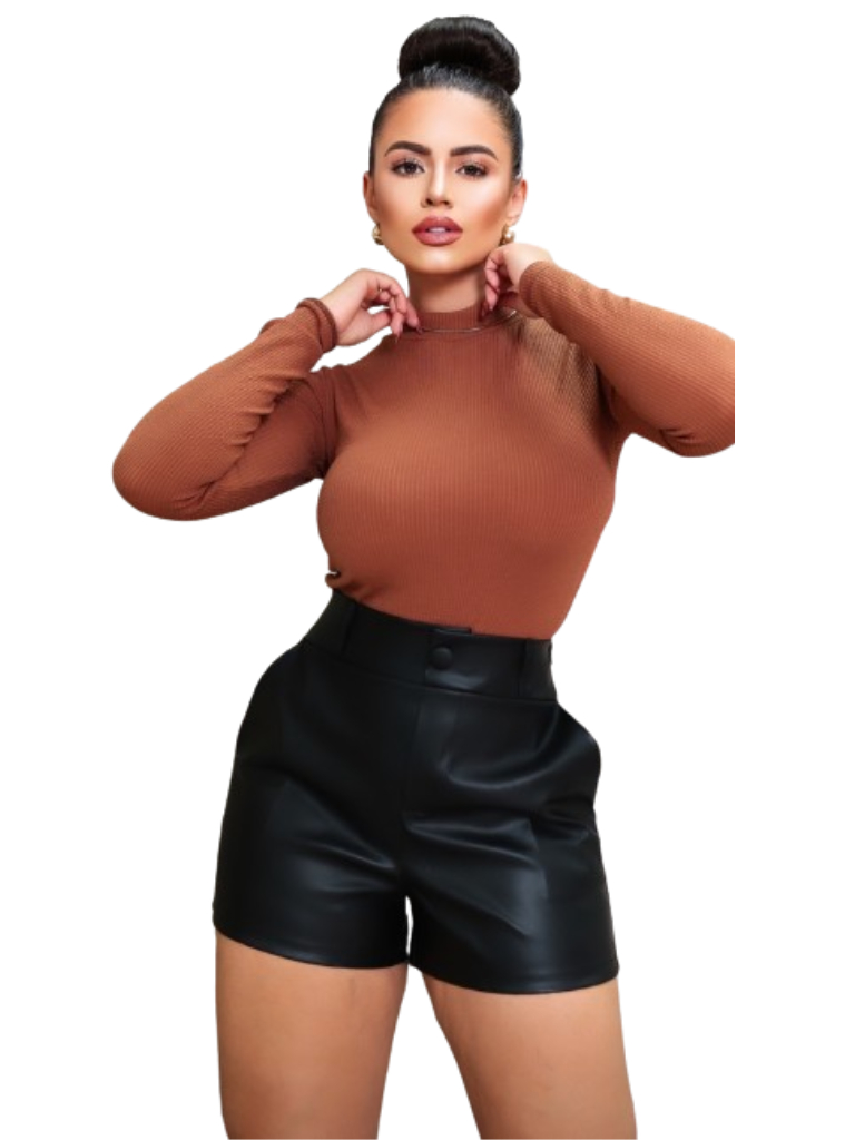 Short Couro Fake Feminino Courino Botão Zíper Lateral Com Bolso Moda Blogueira Cintura Alta Preto