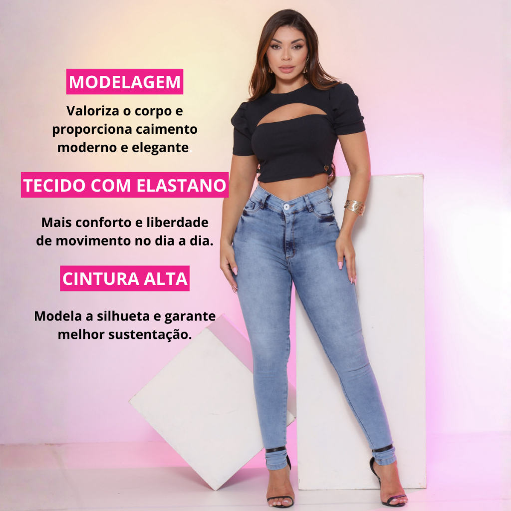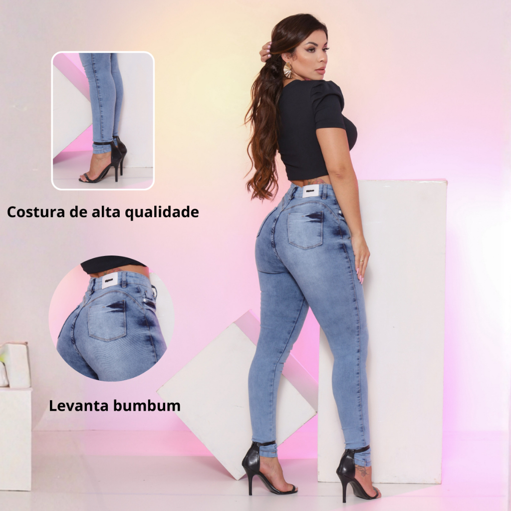 Calça Jeans Feminina Marmorizada com Lycra Cós Alto Modelo Empina bumbum