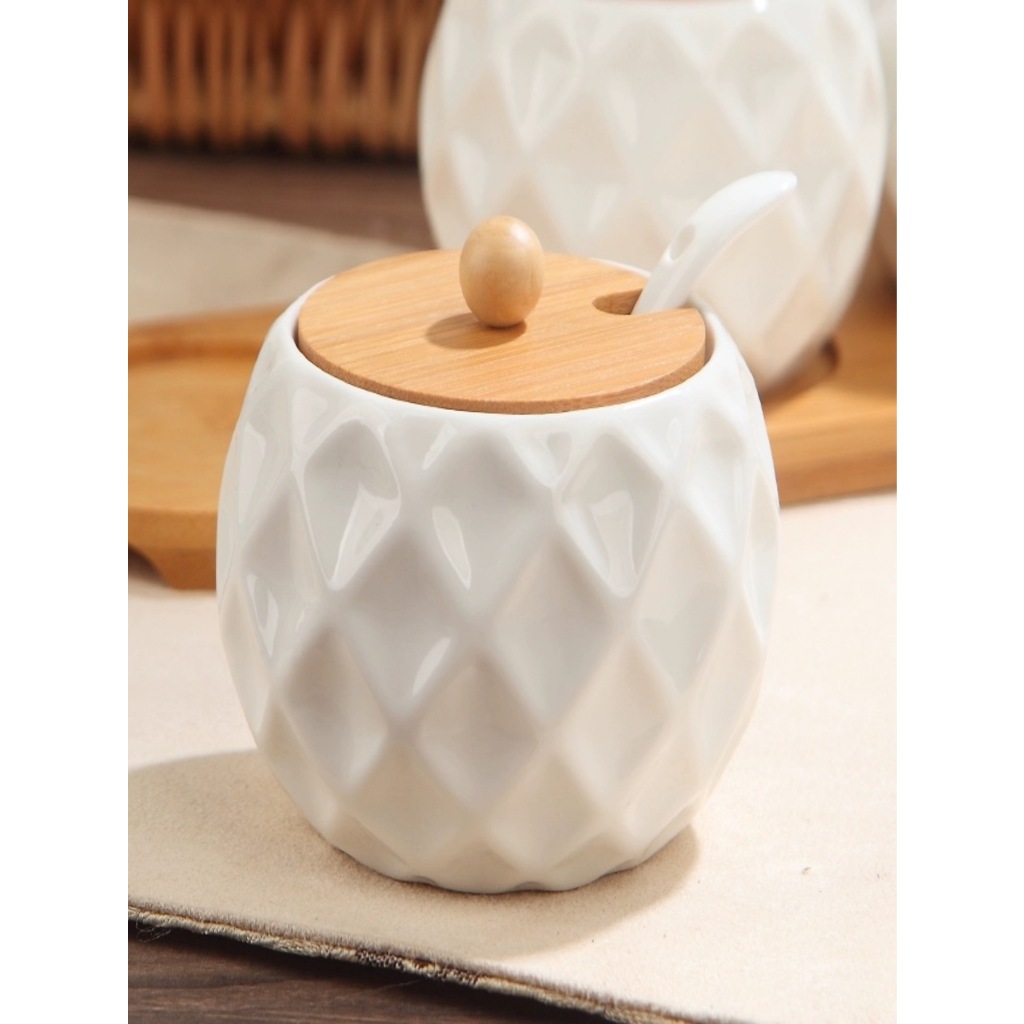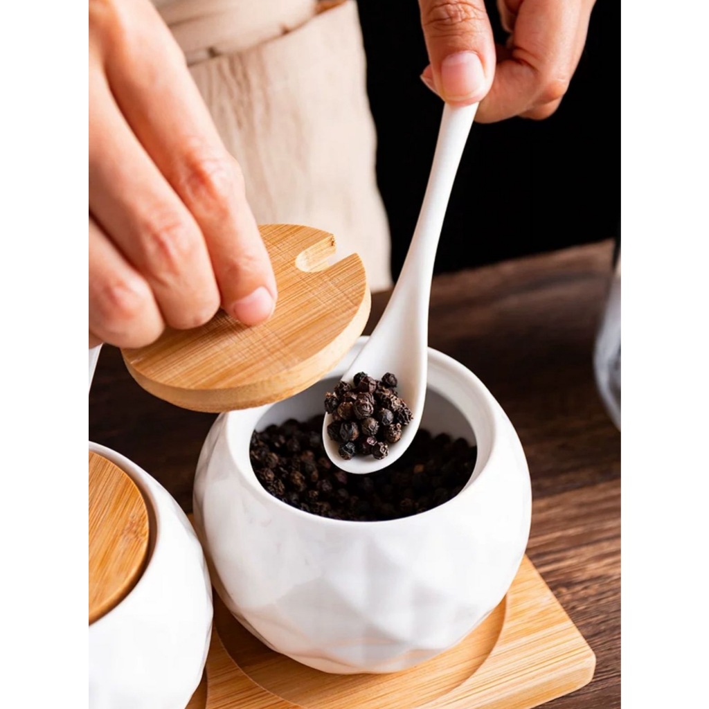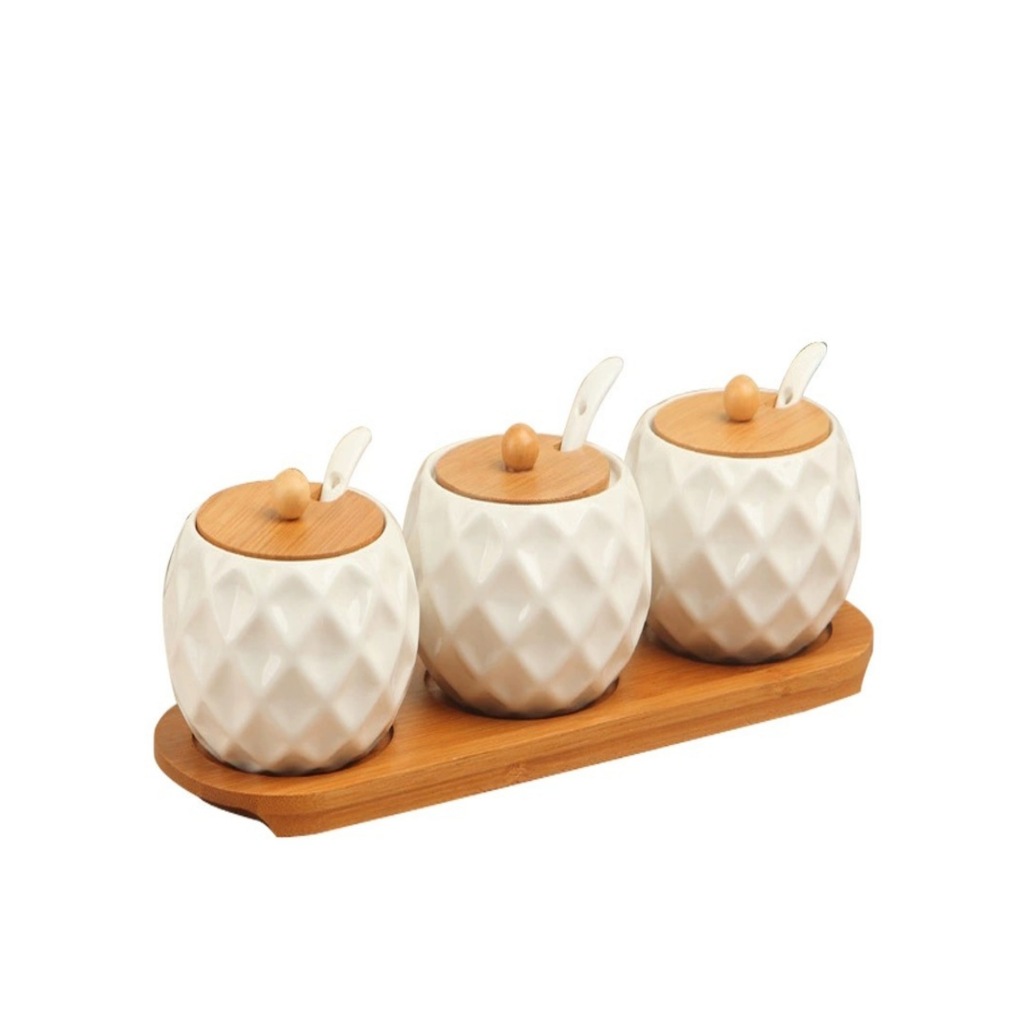 Kit Com 3 Peças Porta Mantimento em Cerâmica com Tampa de bambu com bandeja colher de bambu