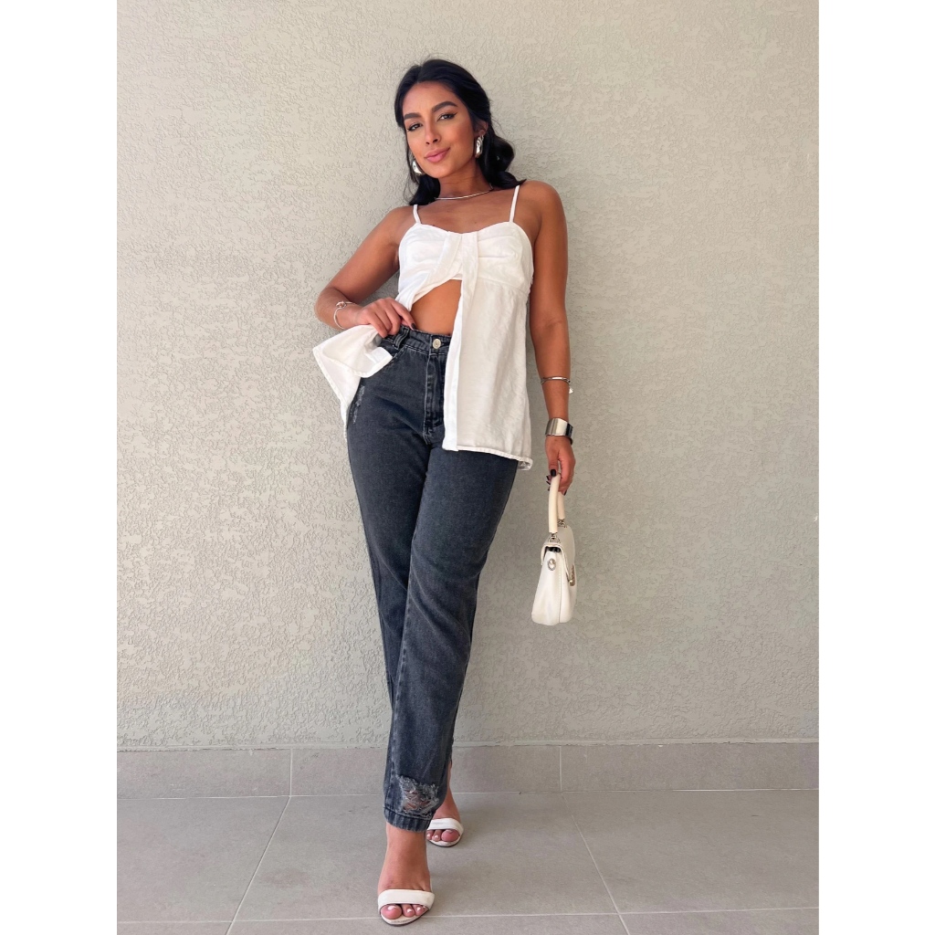 Kissmelady 8395 8419 Calça Jeans Mom Feminina Sem Elastano com Lantejoulas e Bolsos Reais