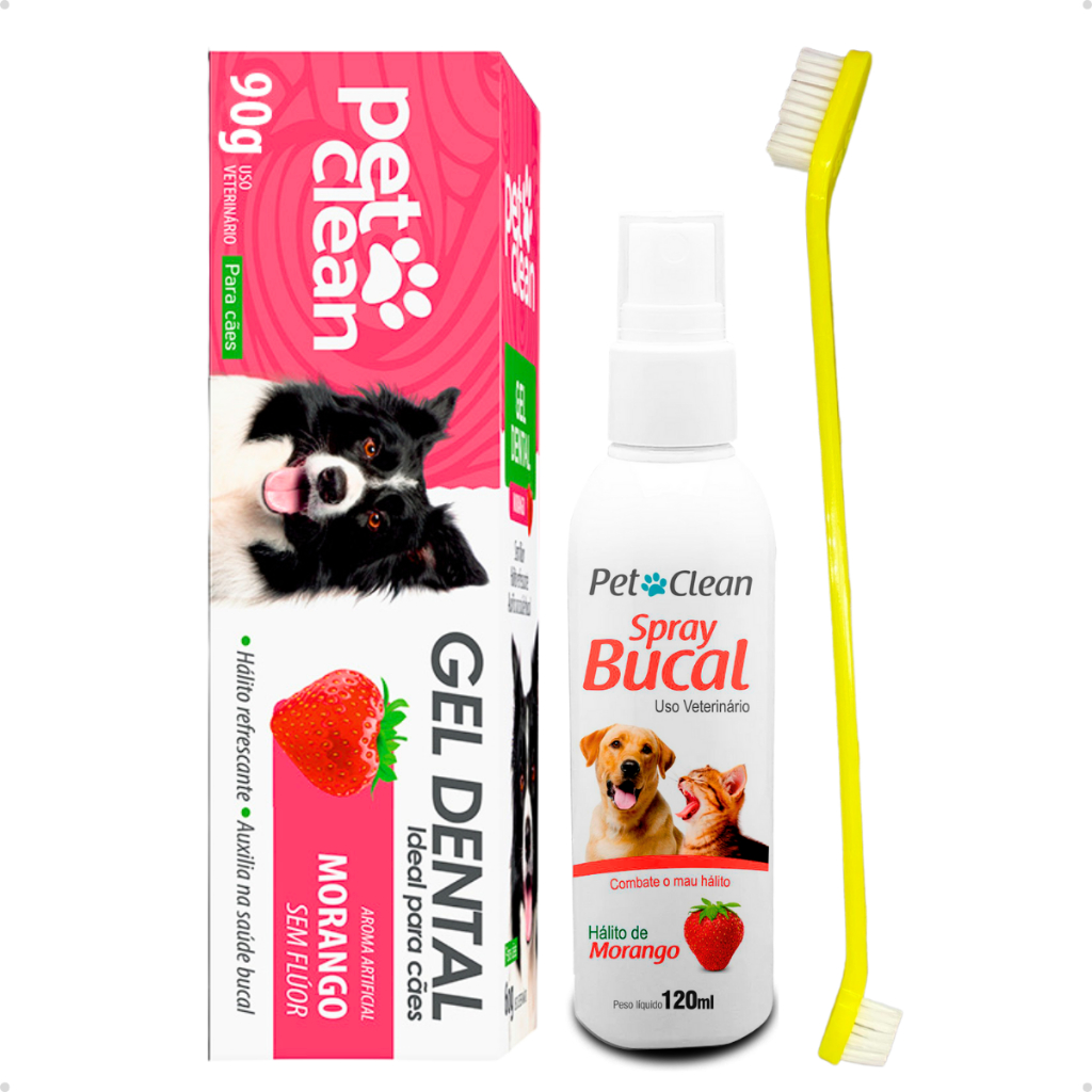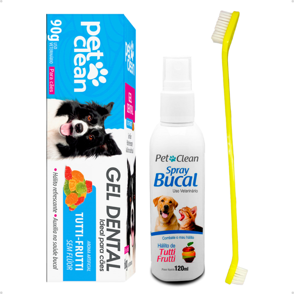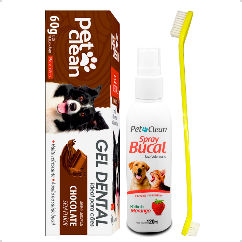 Kit Gel Dental Pasta de Dente Pet Clean + Spray Bucal + Escova de Dente Dupla para Cachorro e Gato