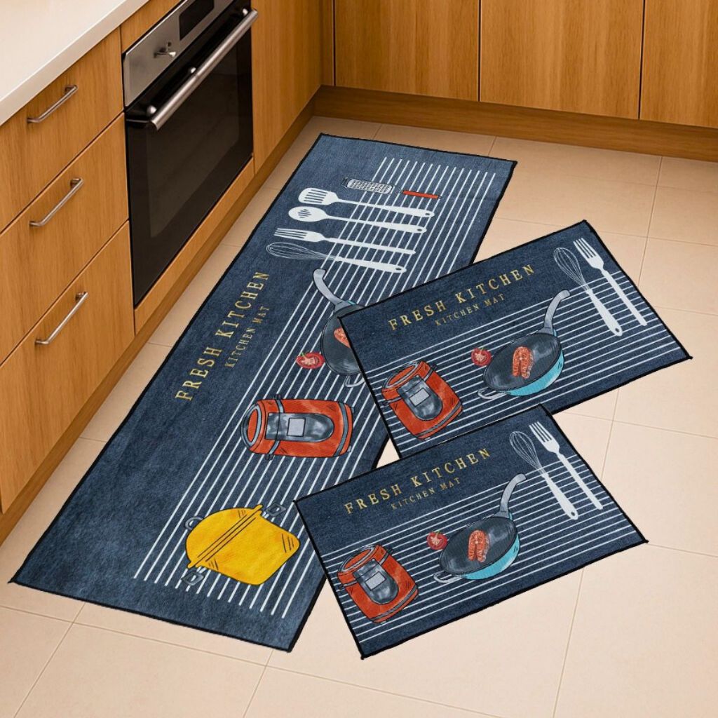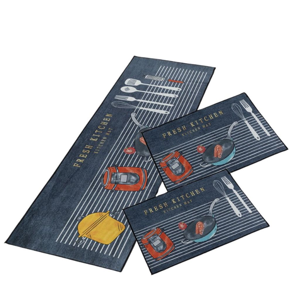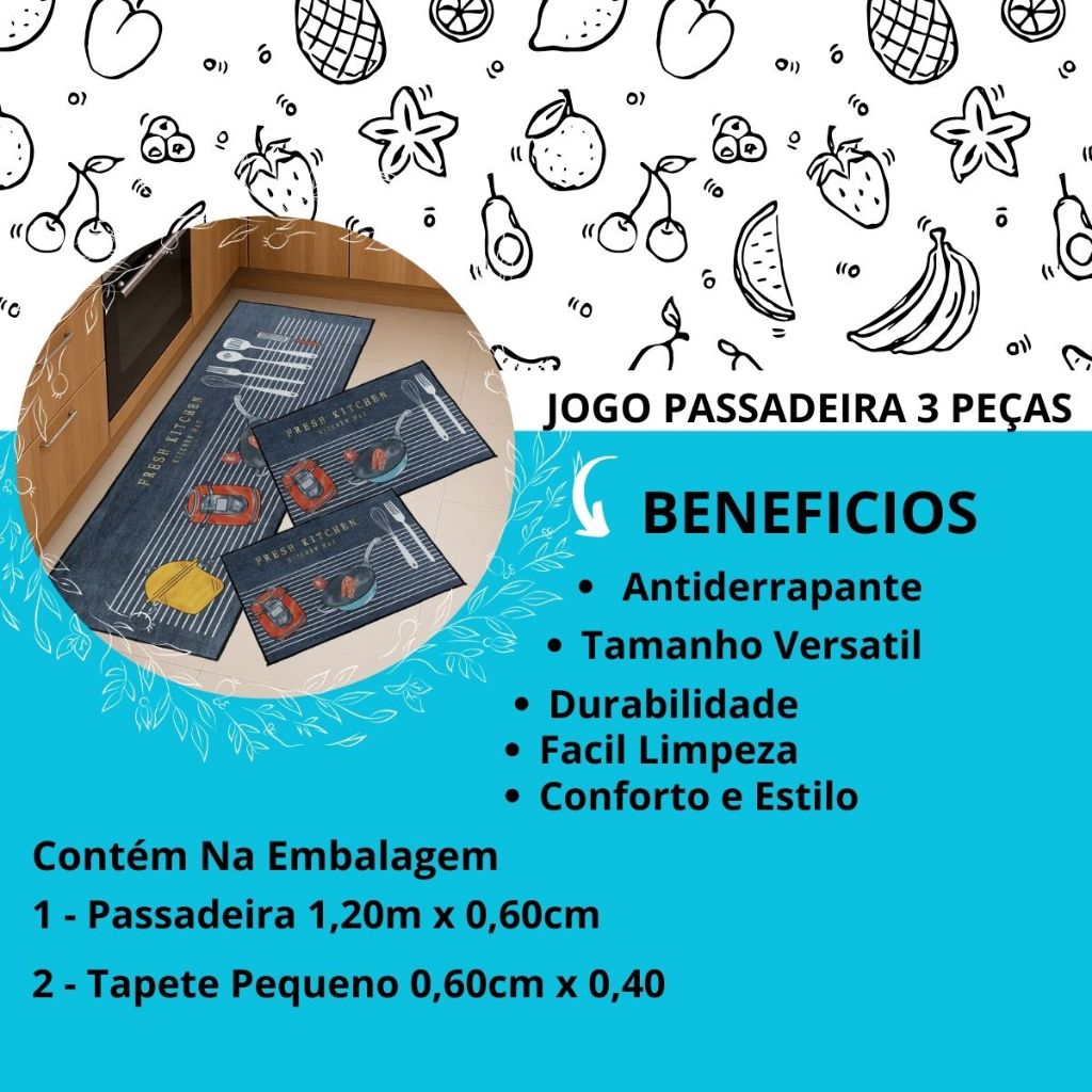 Tapete Passadeira Jogo Cozinha Trilho Decorativo 3 Pçs Antiderrapante Emborrachado Preto Decoração